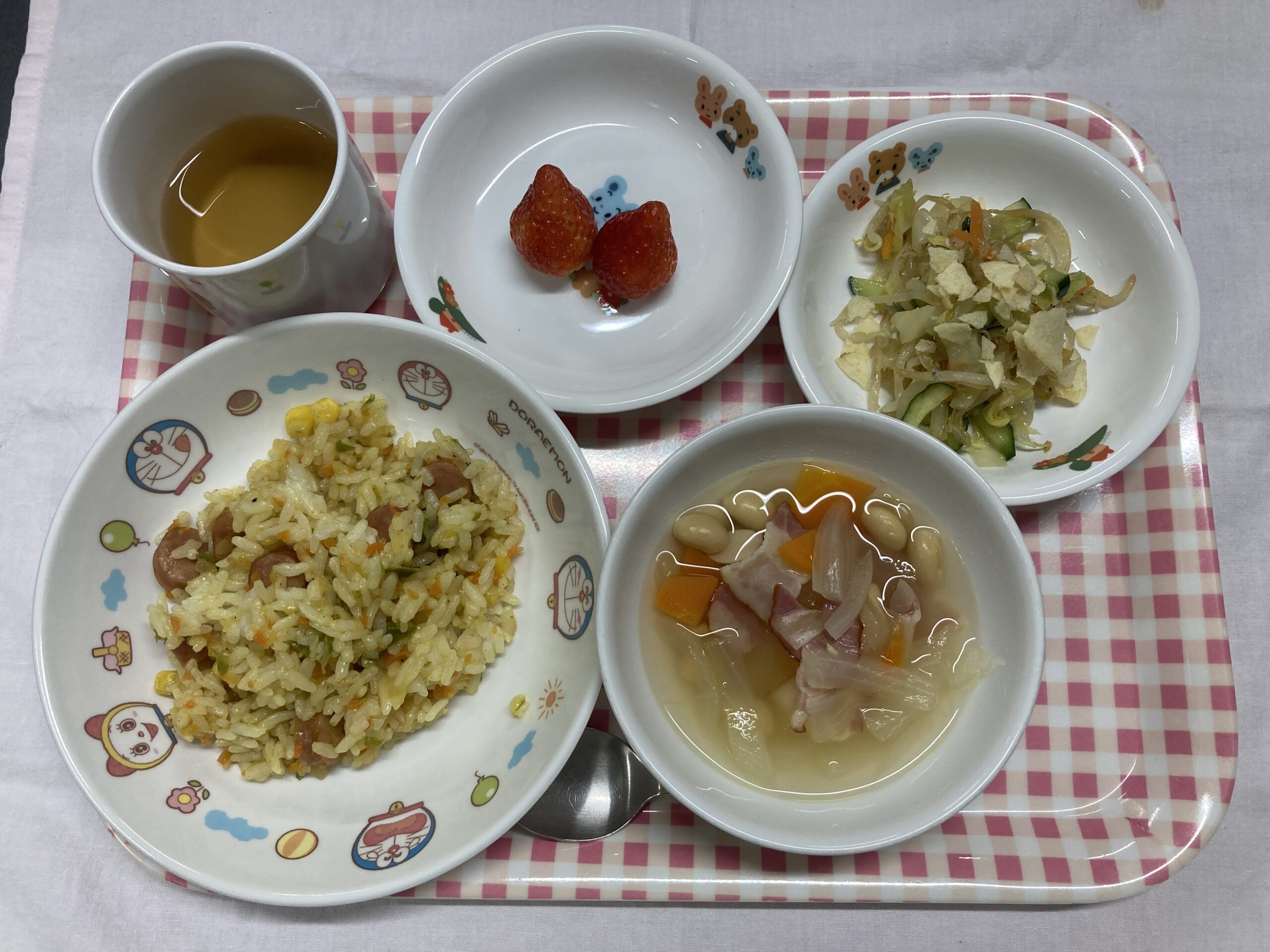 ・カレーピラフ ・パリパリサラダ ・ビーンズスープ ・いちご