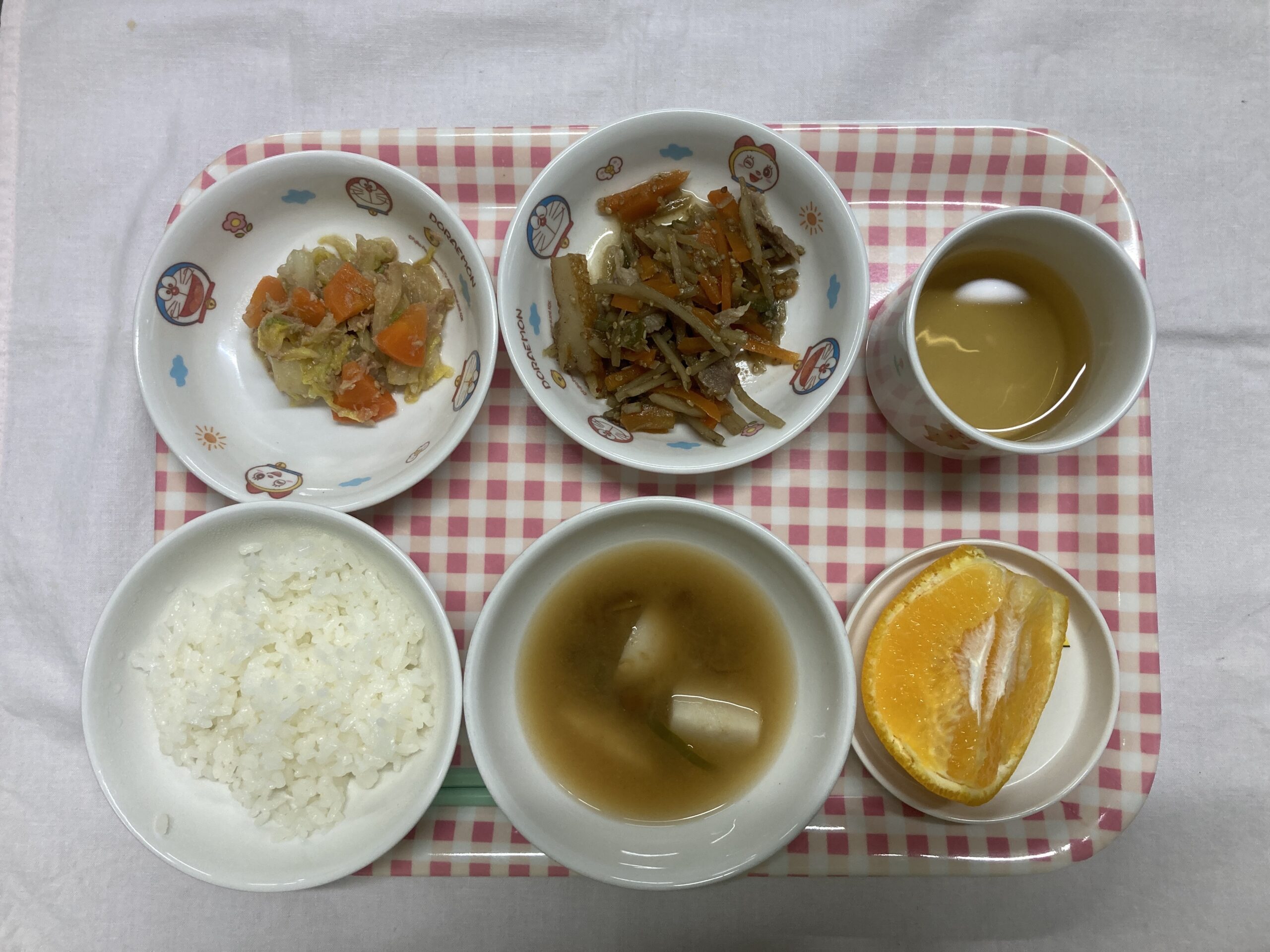 ・ごはん ・栄養きんぴら ・白菜のツナコーン和え ・なめこと里芋の味噌汁 ・デコポン