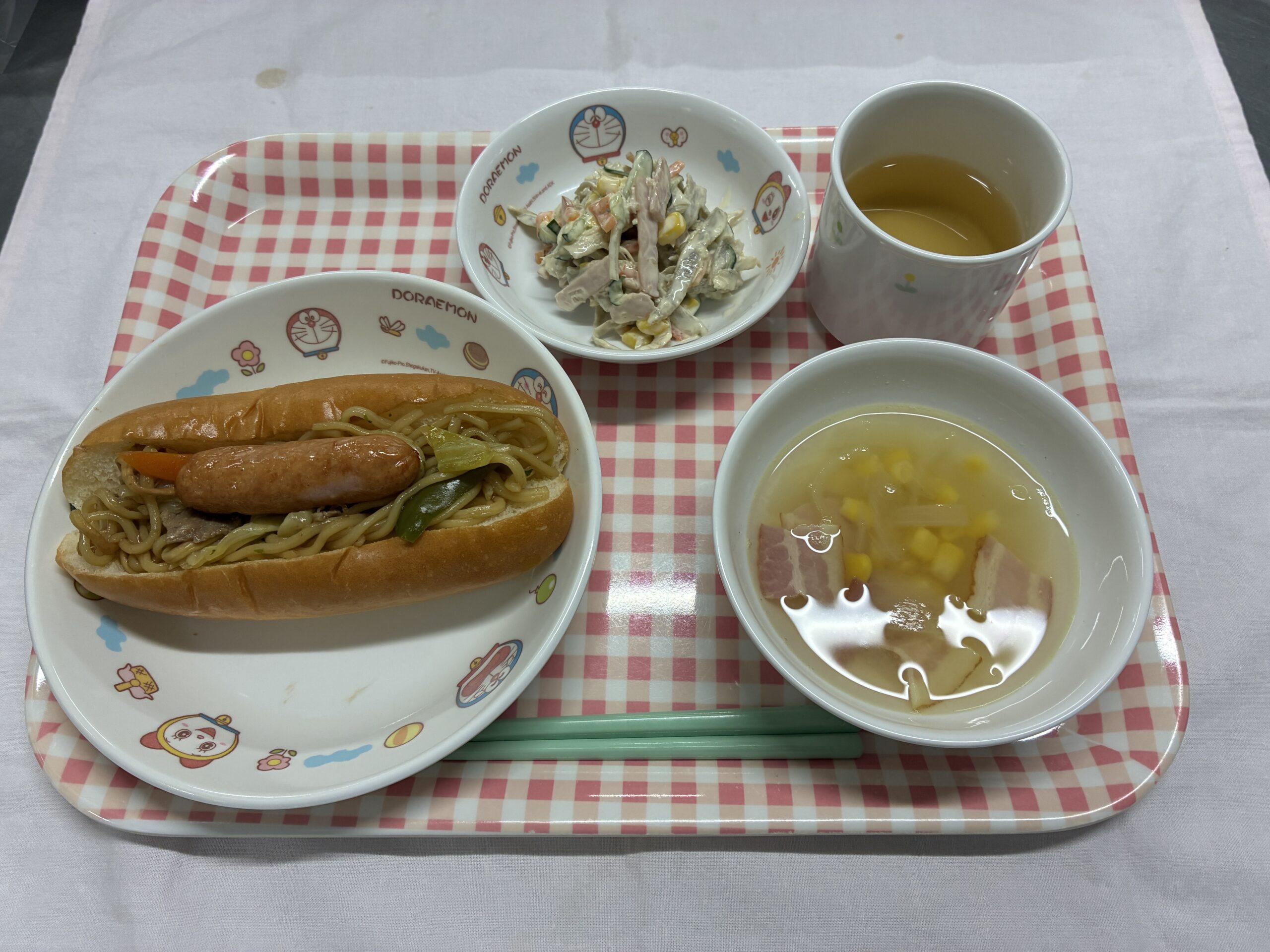 ・焼きそばパン ・ウインナー ・ごぼうサラダ ・コンソメスープ