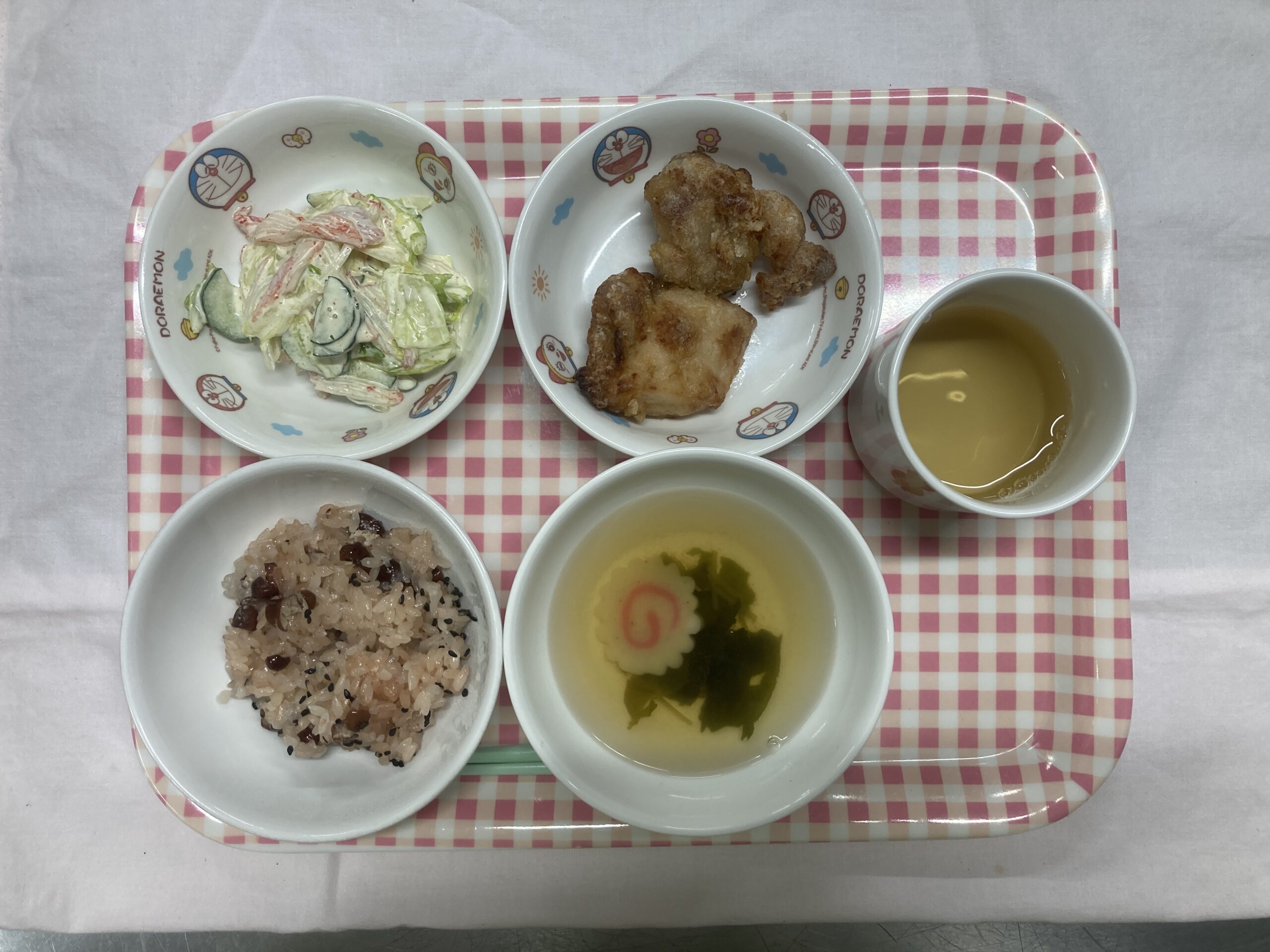 ~誕生日会~ ・赤飯 ・鶏のから揚げ ・レタスのサラダ ・なるととわかめのすまし汁