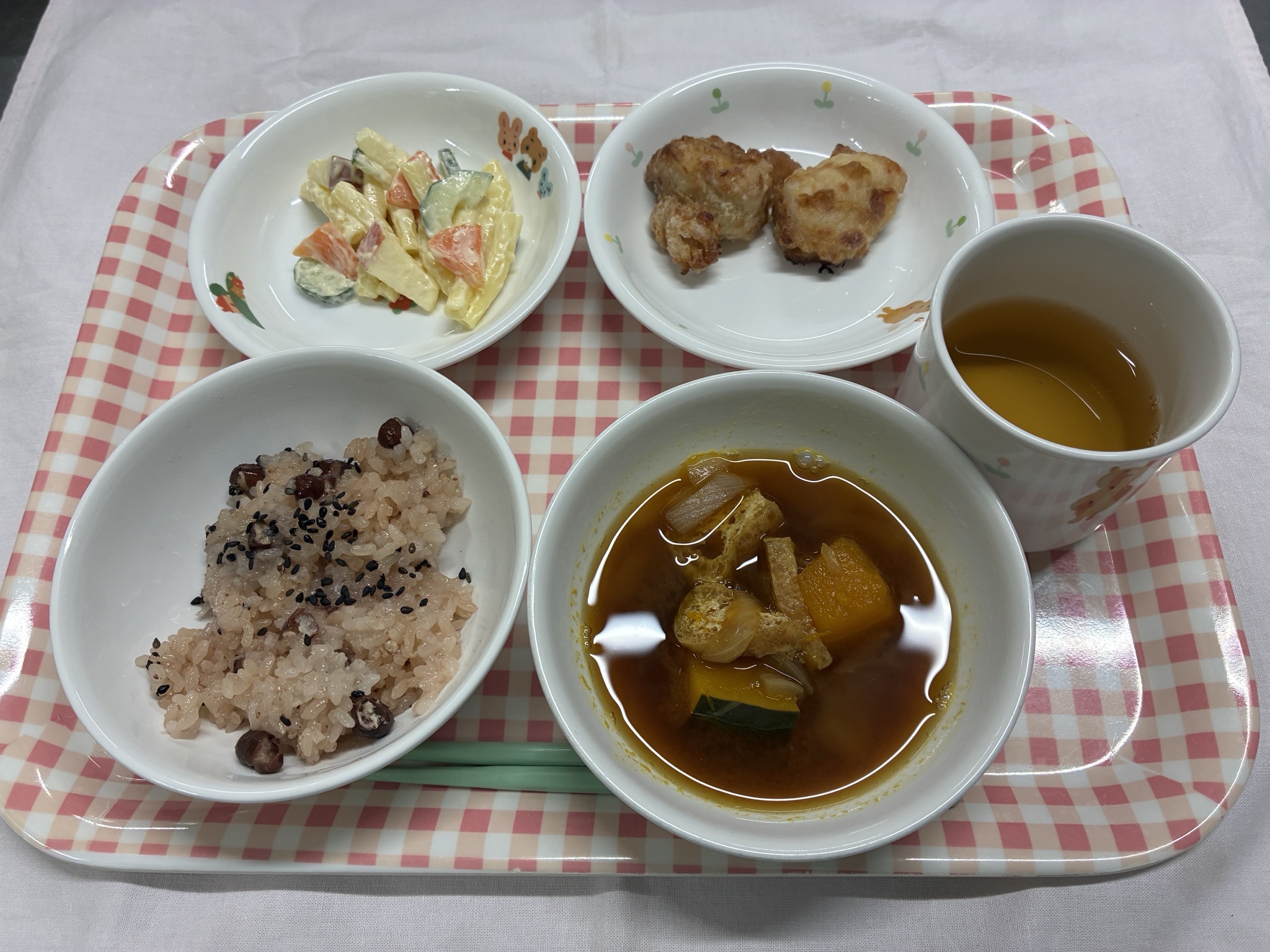 ・赤飯 ・鶏のから揚げ ・マカロニサラダ ・かぼちゃの味噌汁