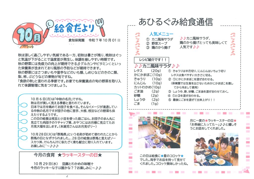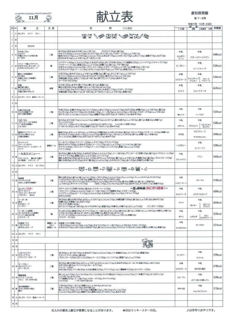 今日のメニュー 今月のこんだて 給食だより 07/10/31 2025年10月31日 ♪ハロウィンメニュー♪ ・カレーピラフ ・かぼちゃのサラダ ・トマトと卵のスープ 11月の献立です 2025年10月28日 先月までのこんだて表 11月の献立です 2025年10月28日 10月の献立です 2025年9月25日 9月の献立です 2025年8月27日 8月の献立表です 2025年7月25日 7月の献立表です 2025年6月26日 6月の献立表です 2025年5月23日 10月 きゅうしょくだより 2025年10月1日