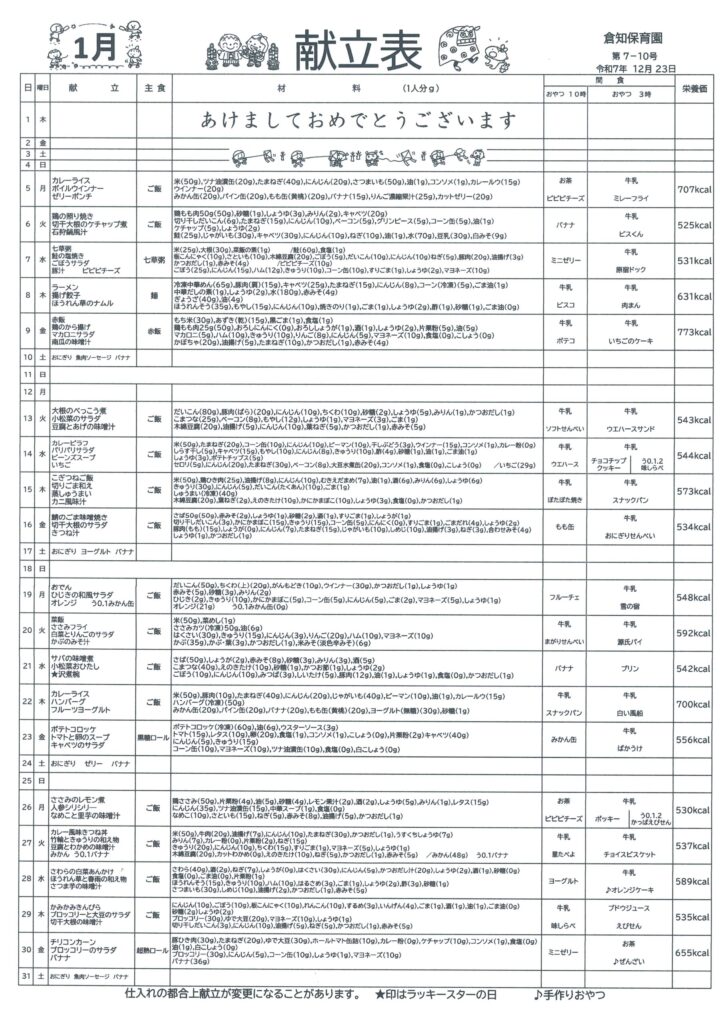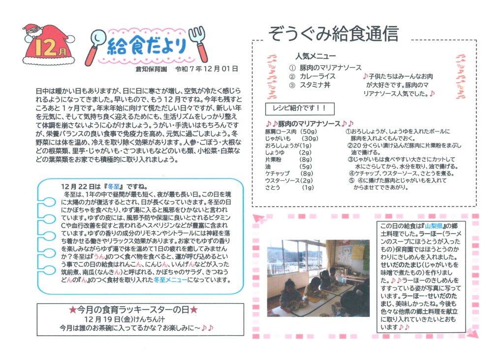 今日のメニュー 今月のこんだて 給食だより 07/12/23 2025年12月23日 ・ごはん ・揚げ魚のあんかけ ・たぬき汁 ・みかん 1月の献立表です 2025年12月22日 先月までのこんだて表 1月の献立表です 2025年12月22日 12月の献立表です 2025年11月27日 11月の献立です 2025年10月28日 10月の献立です 2025年9月25日 9月の献立です 2025年8月27日 8月の献立表です 2025年7月25日 12月 給食だより 2025年11月28日