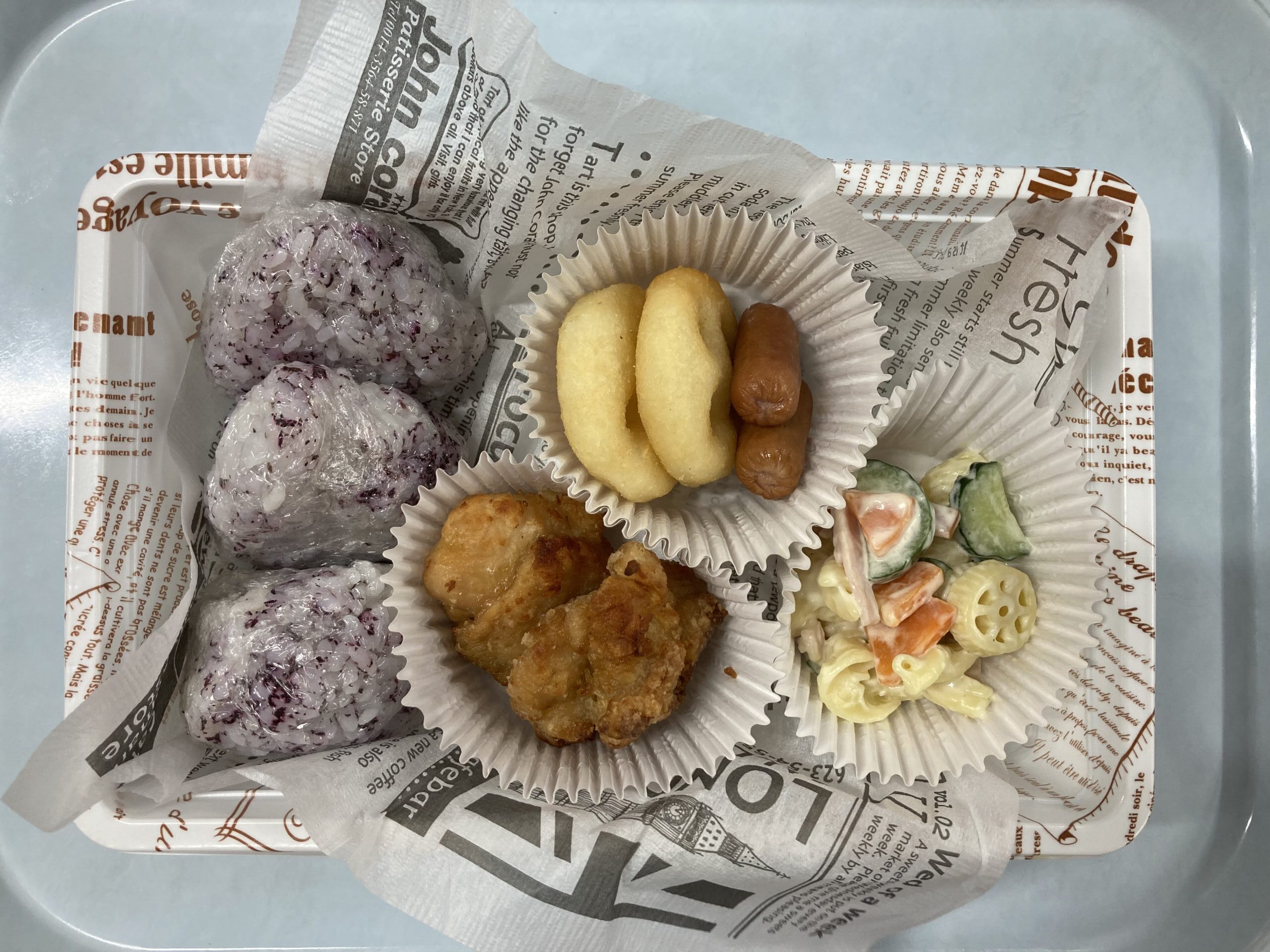 ・ゆかりごはん ・鶏のから揚げ ・マカロニサラダ ・スマイルポテト ・ボイルウインナー