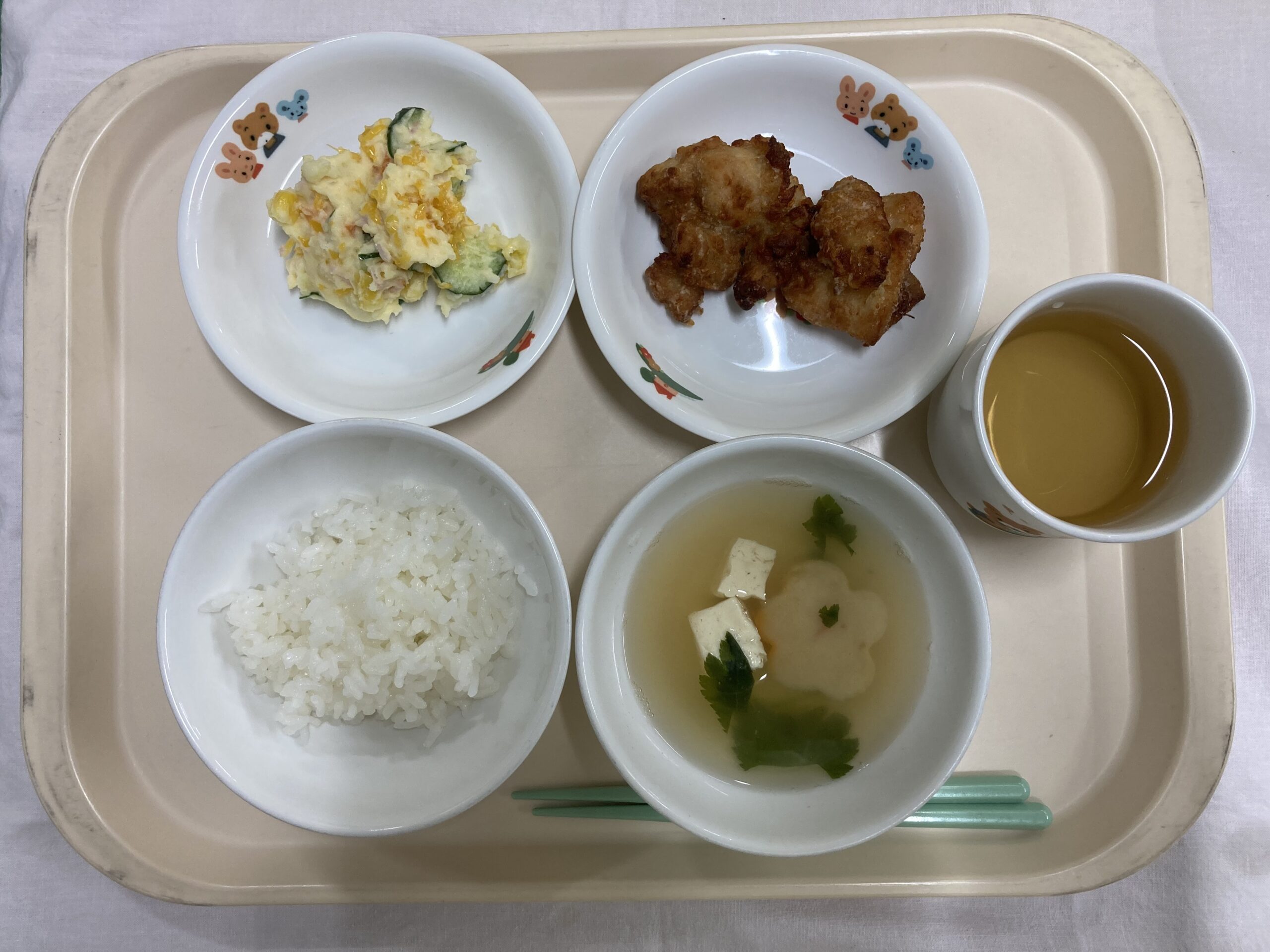 ・ごはん ・鶏のから揚げ ・ポテトサラダ ・豆腐と麩のすまし汁