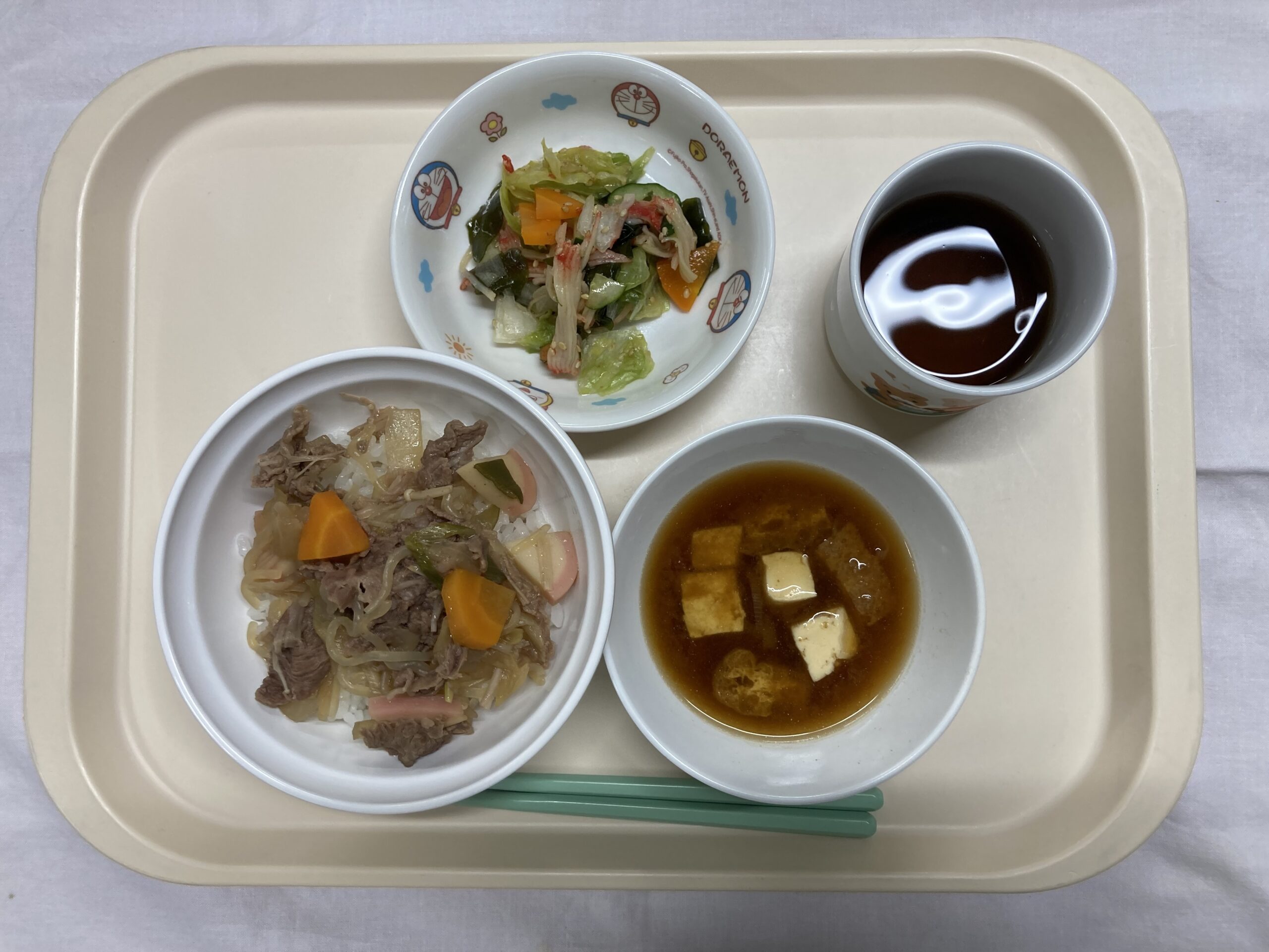 ・牛丼 ・カニ風味サラダ ・豆腐とわかめの味噌汁