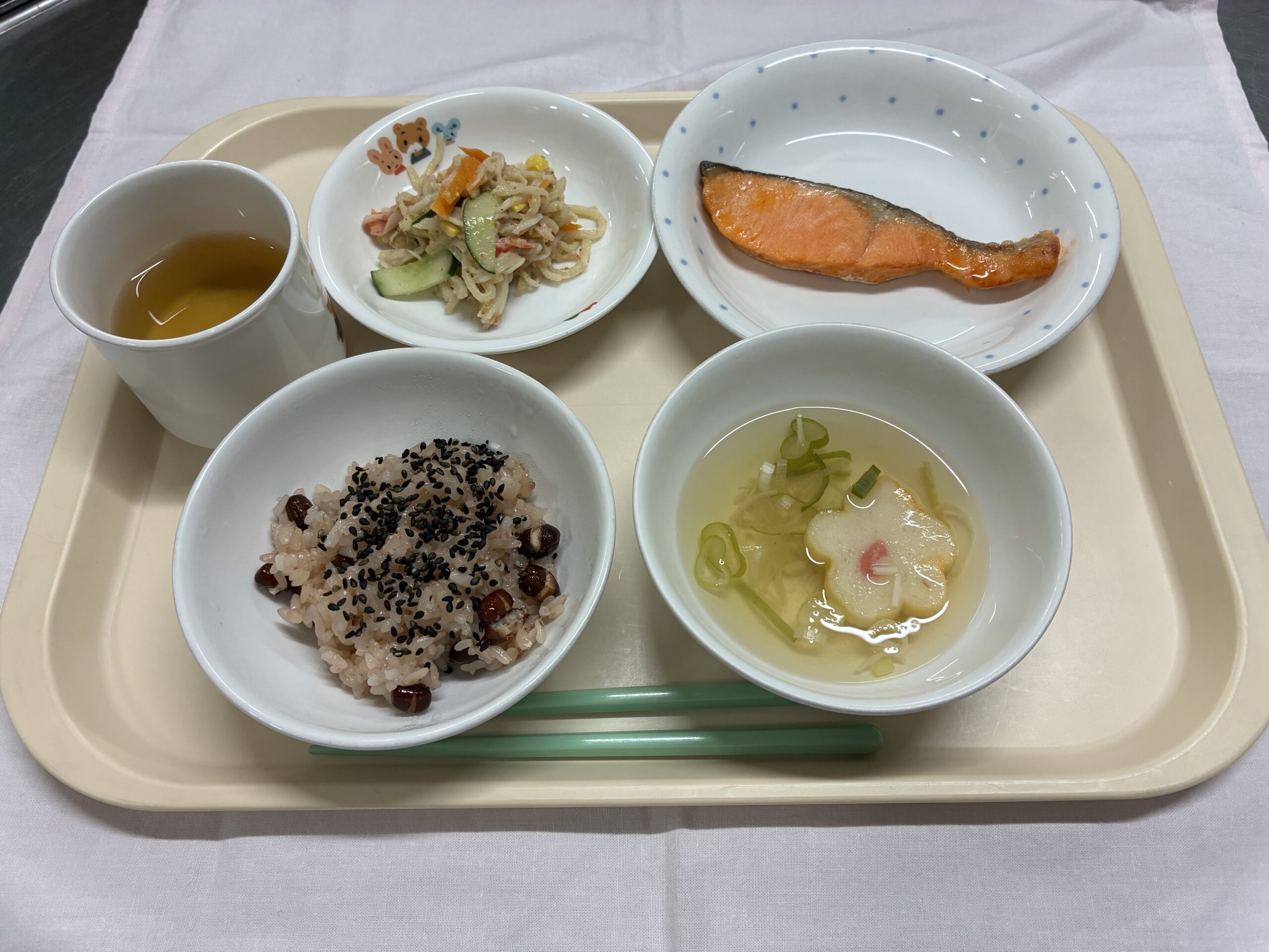 ・ご飯 ・鮭の塩焼き ・切干大根のサラダ ・花麩のすまし汁