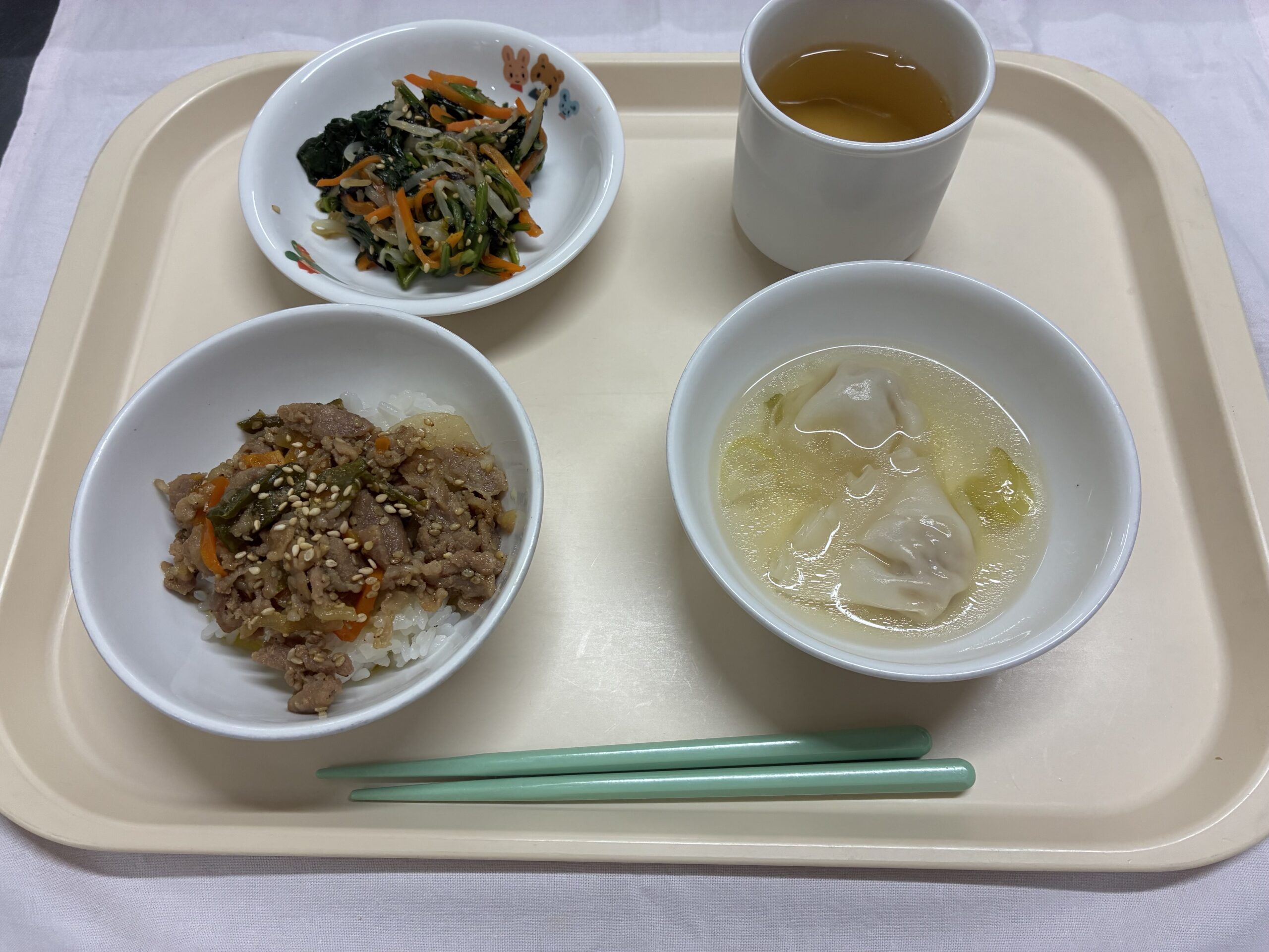 ・焼肉丼 ・ほうれん草のナムル ・ワンタンスープ