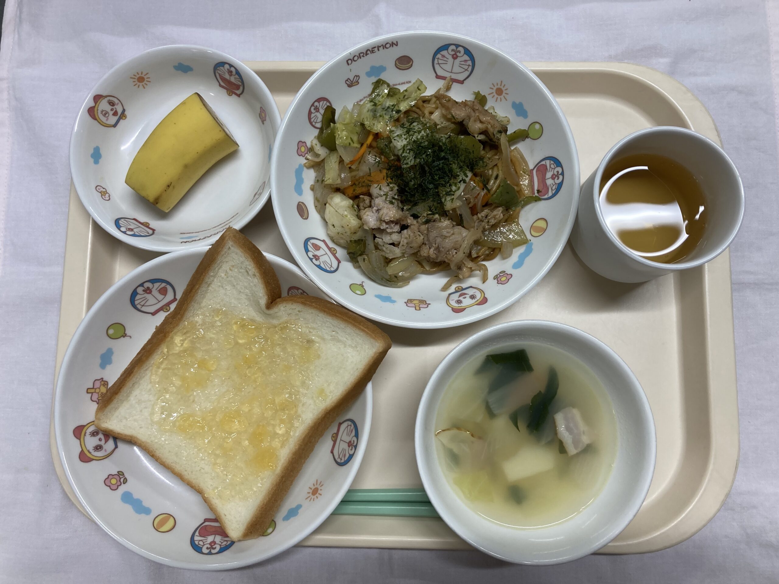 ・超熟食パン(りんごジャム}・焼きそば ・野菜スープ ・バナナ