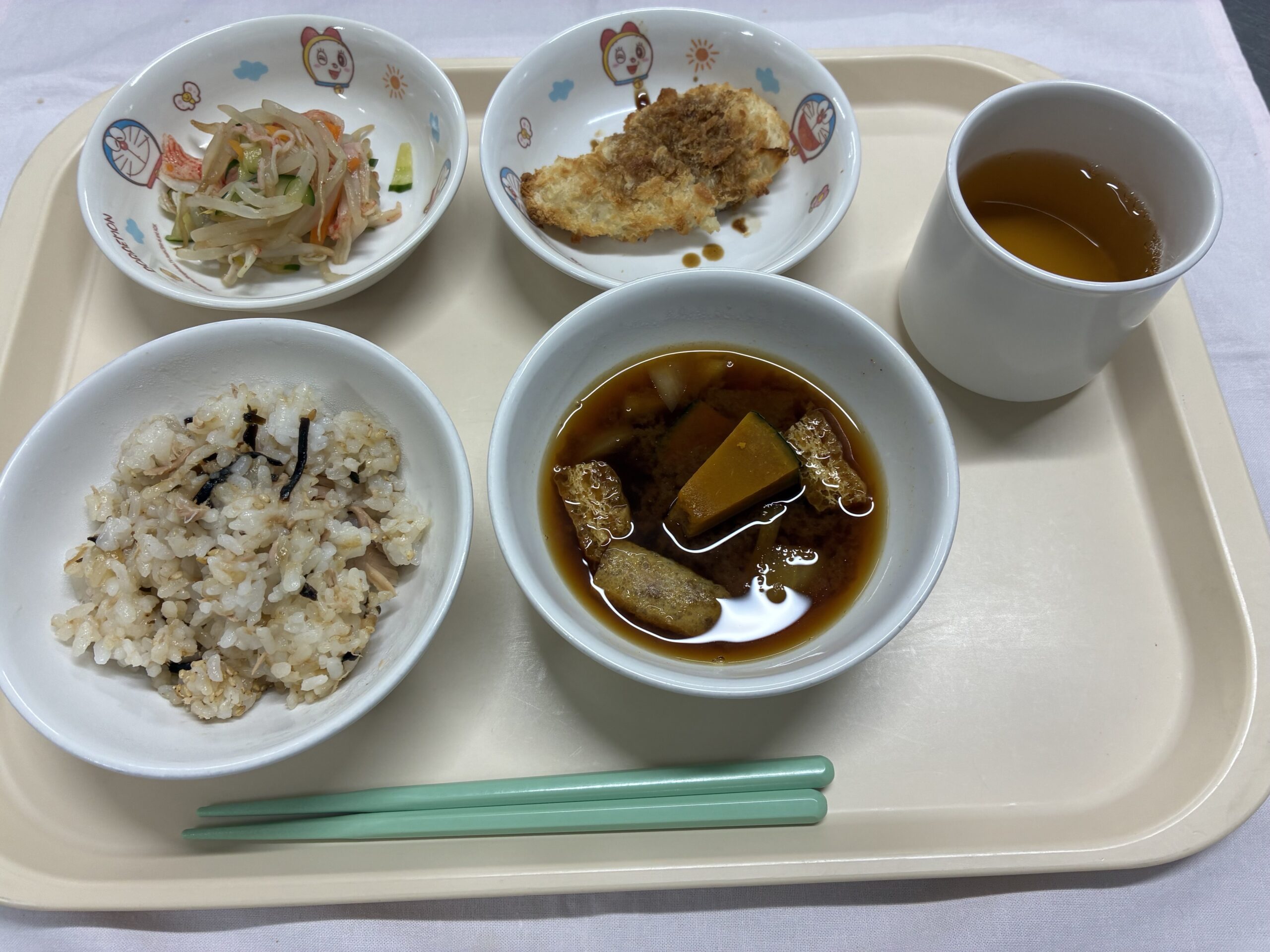 ・ツナ昆布ごはん ・ささみカツ ・もやしの和え物 ・南瓜の味噌汁