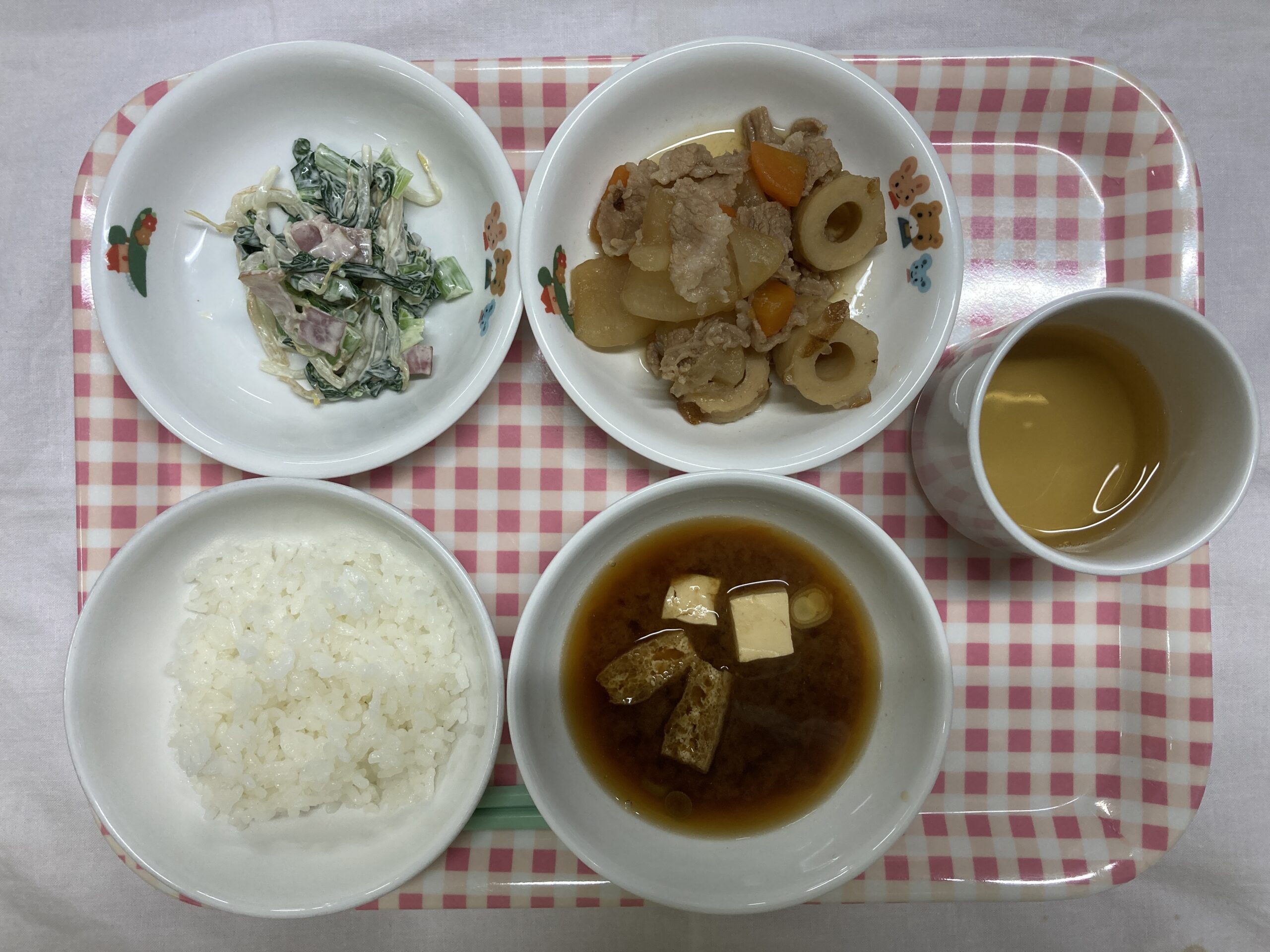 ・ごはん ・大根のべっこう煮 ・小松菜のサラダ ・豆腐とあげの味噌汁