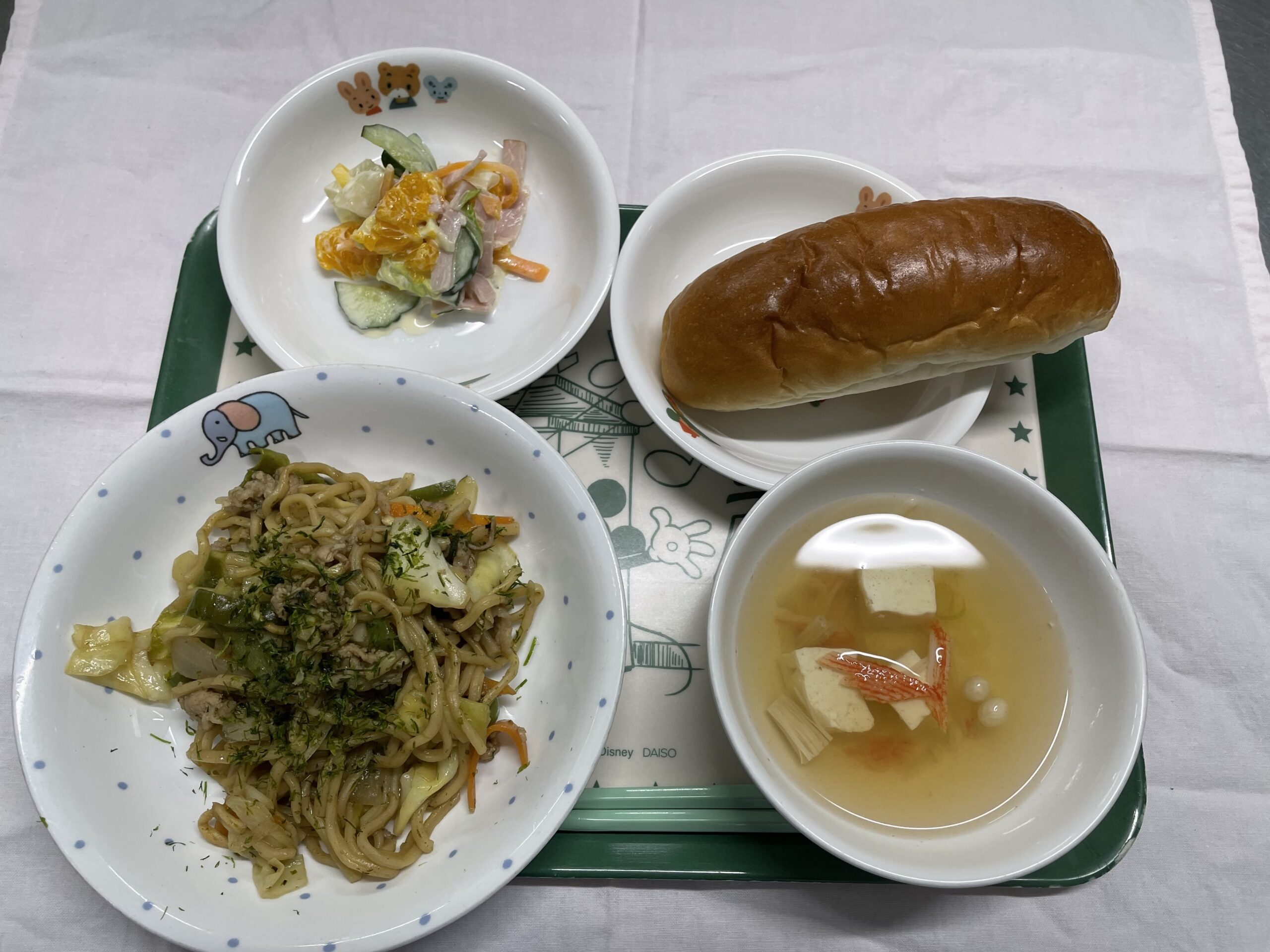 ・超熟ロールパン ・焼きそば ・白菜とみかんのサラダ ・カニ風味汁