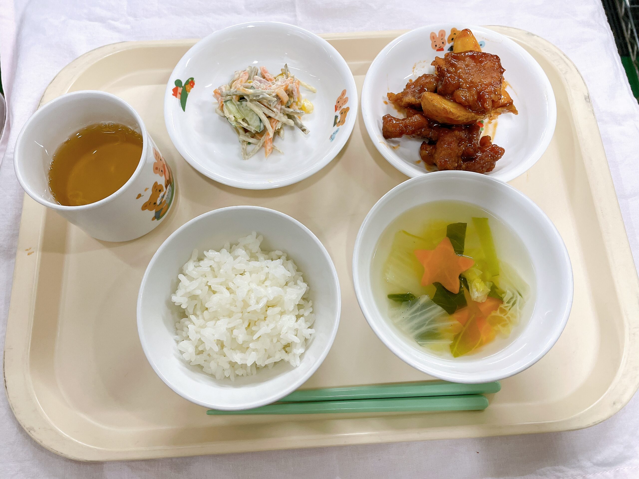 ・ごはん ・豚肉のマリアナソース ・ごぼうサラダ ・白菜とチンゲン菜のスープ