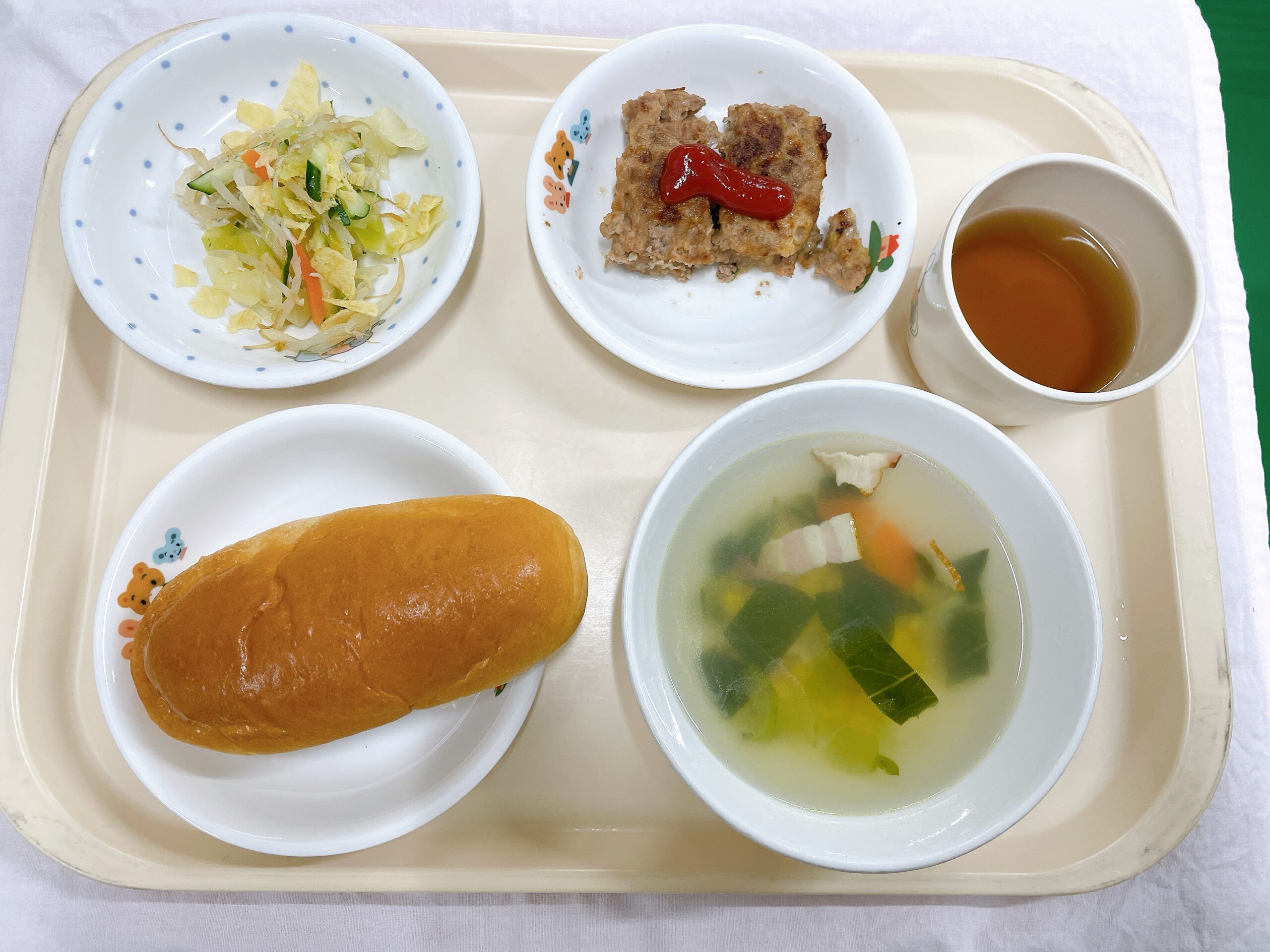・超熟ロールパン ・ハンバーグ ・パリパリサラダ ・コンソメスープ