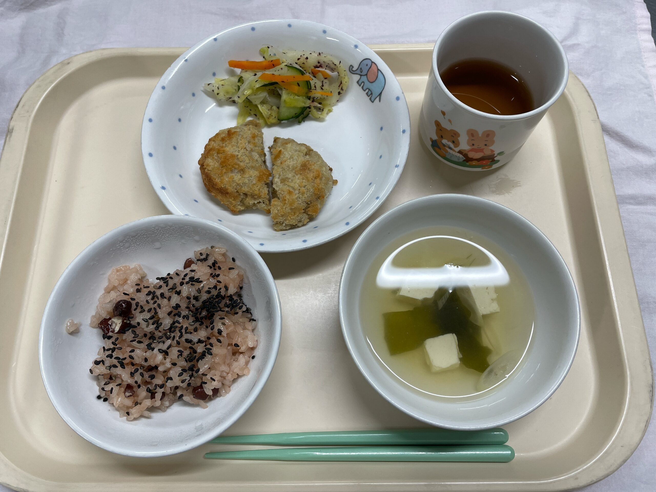 ・赤飯 ・ポテトコロッケ ・キャベツのゆかり和え ・豆腐とわかめのすまし汁