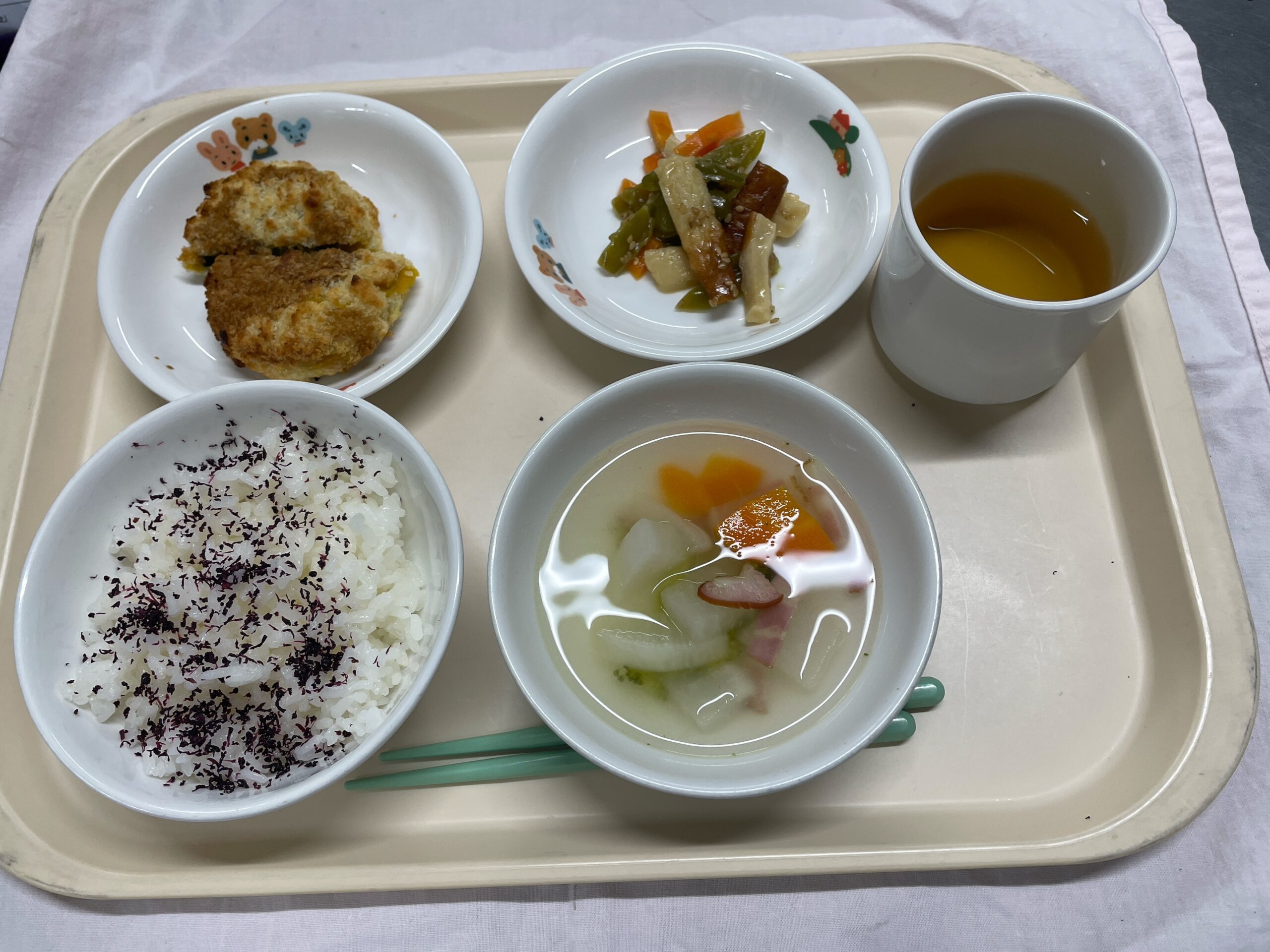 ・ごはん ・ピーマンの炒め物 ・かぼちゃコロッケ ・ブロッコリーのスープ