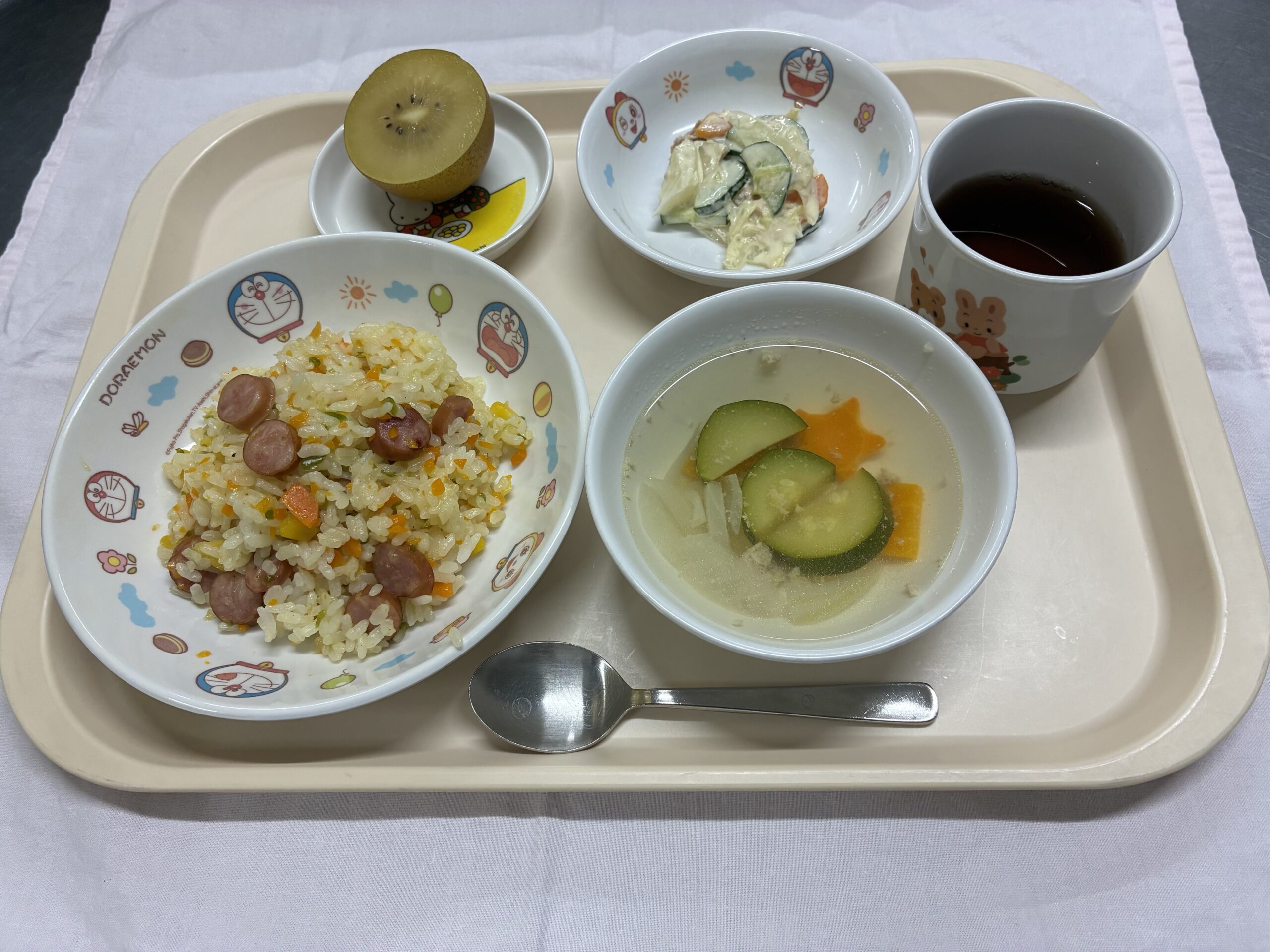・ウインナーピラフ ・キャベツのサラダ ・ズッキーニのスープ ・キウイフルーツ