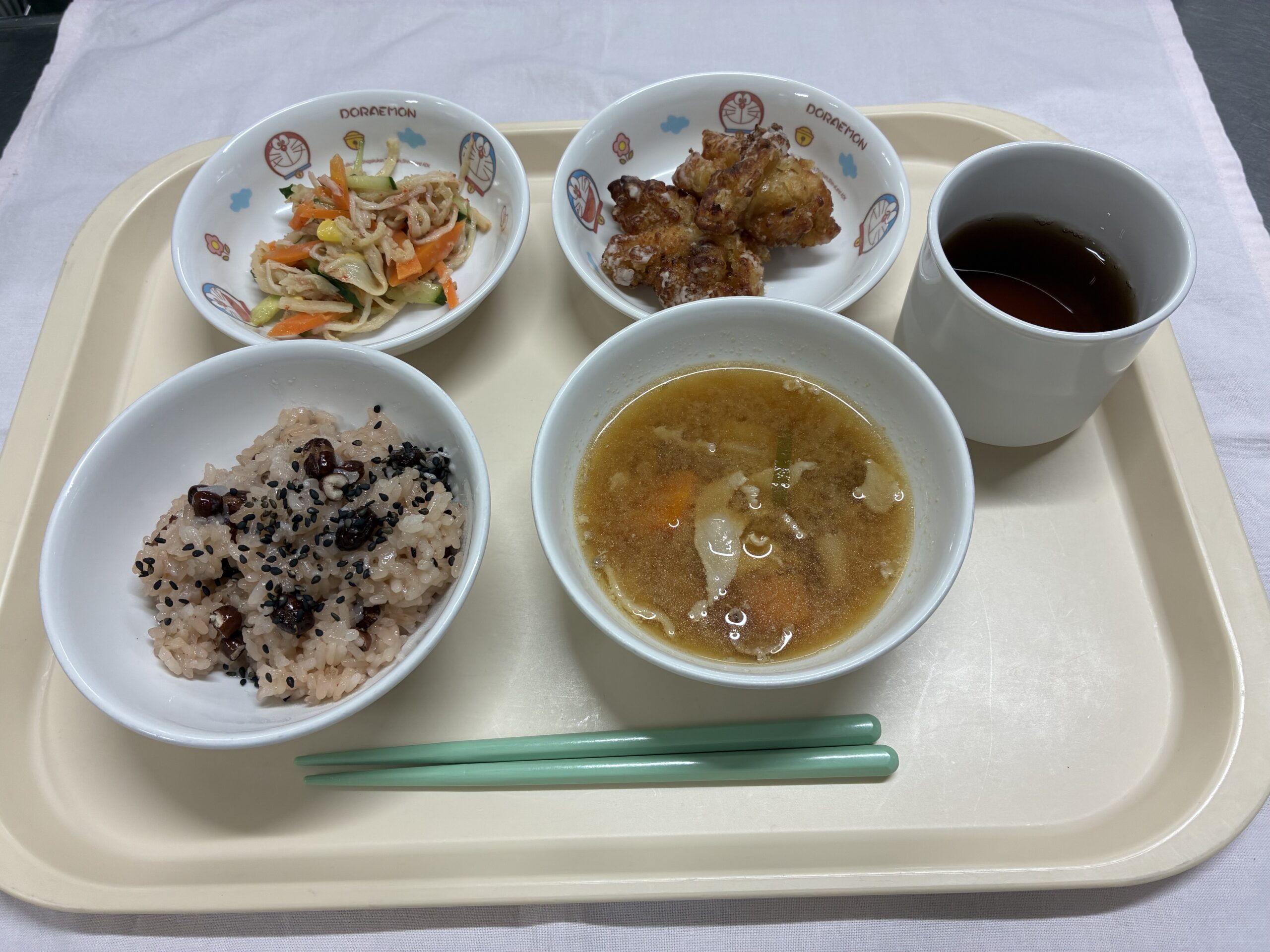 ・赤飯 ・鶏のから揚げ ・切り干し大根のサラダ ・きつね汁