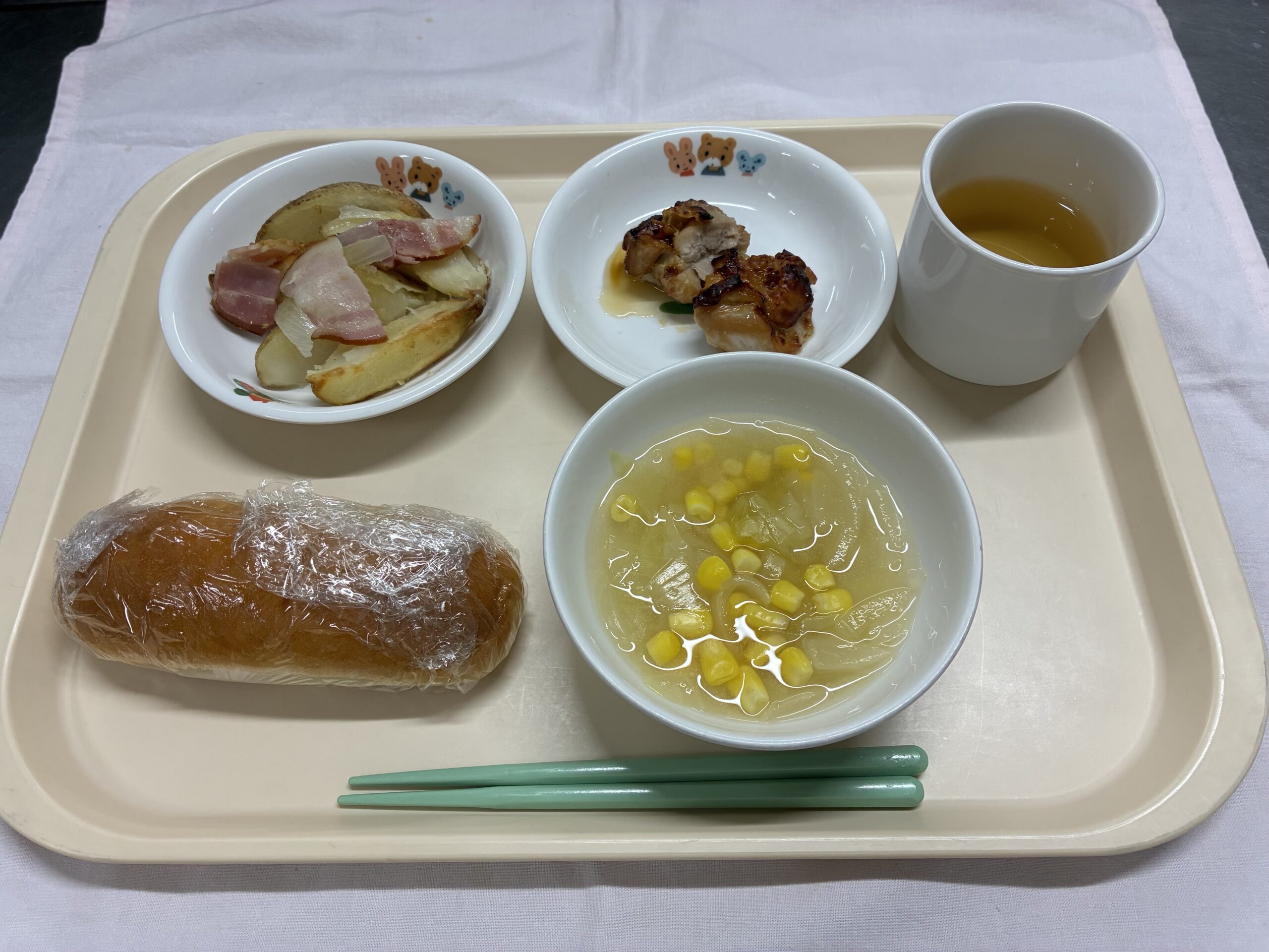 ・超熟パン ・照り焼きチキン ・ジャーマンポテト ・キャベツとコーンの味噌汁