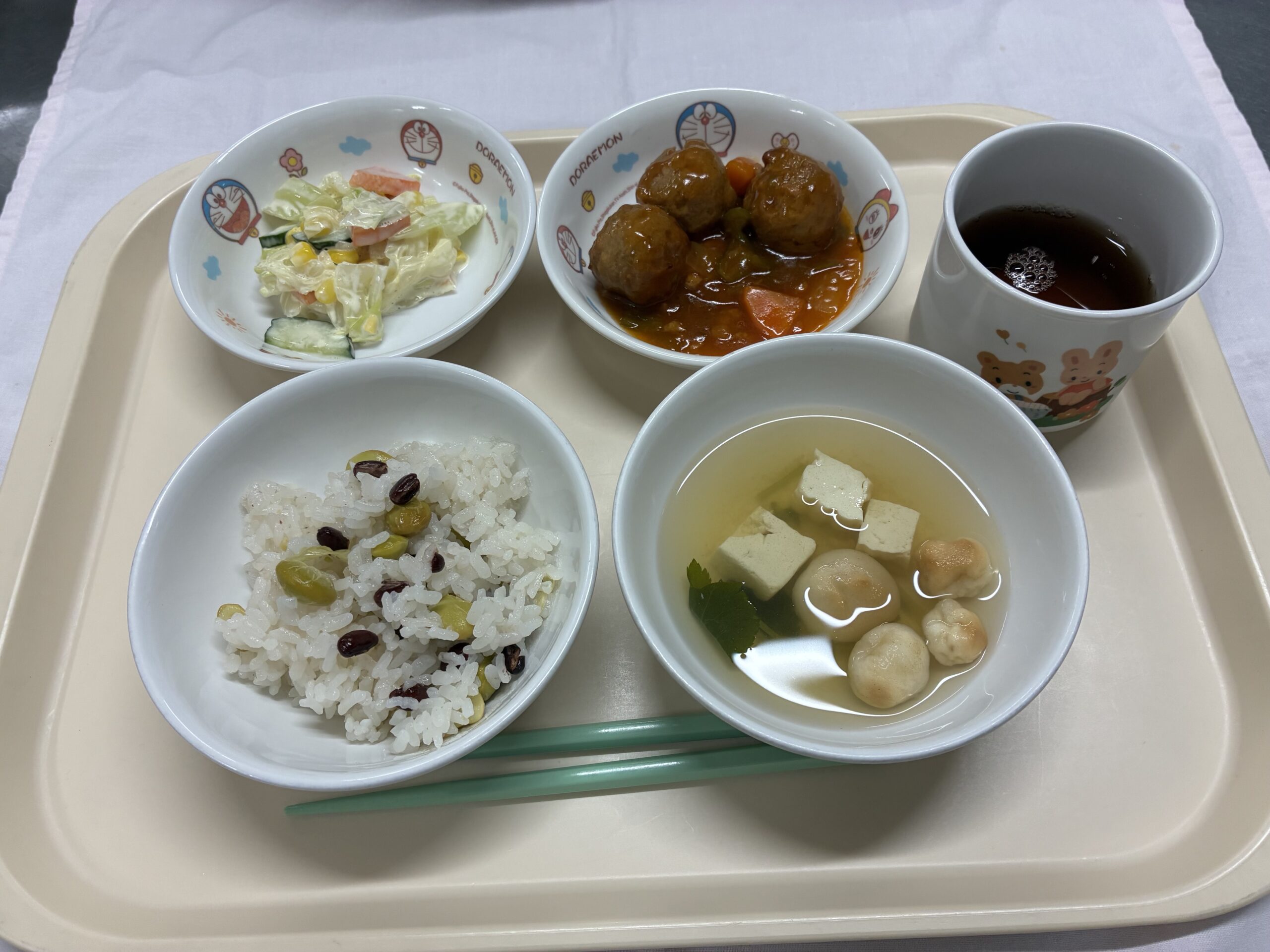 ・萩ごはん ・肉団子のケチャップ煮 ・キャベツのサラダ ・豆腐と麩のすまし汁