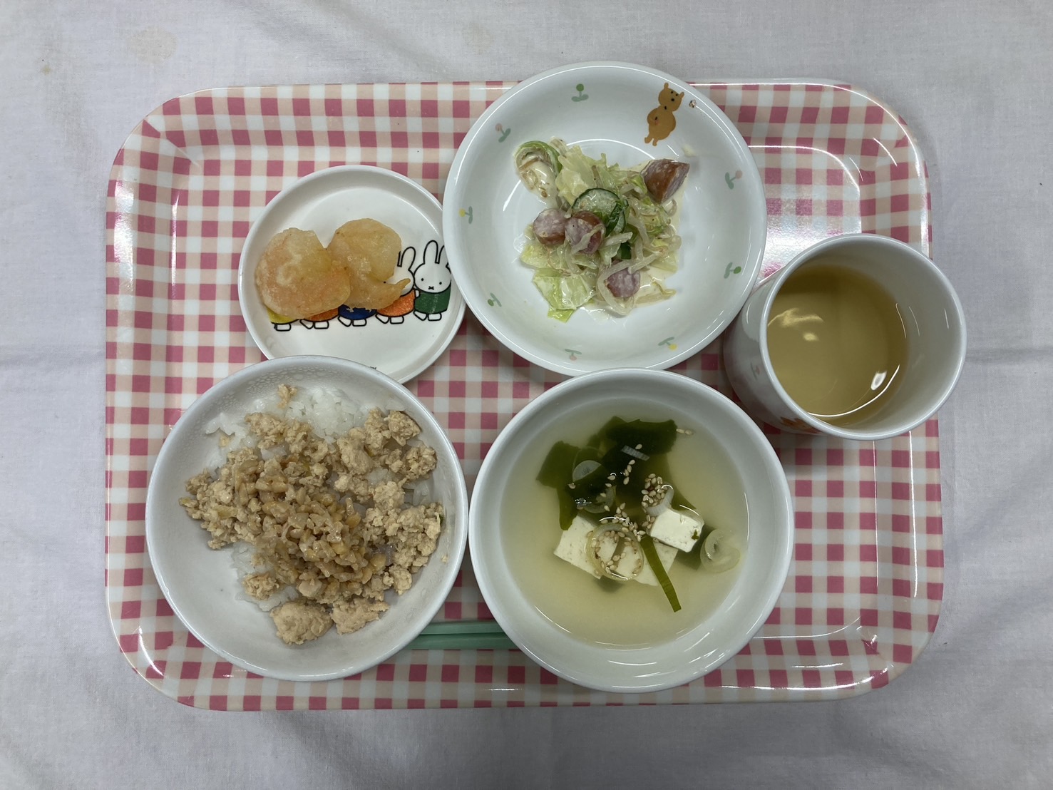 ・スタミナ丼 ・エビフリッター ・キャベツのごまサラダ ・わかめスープ