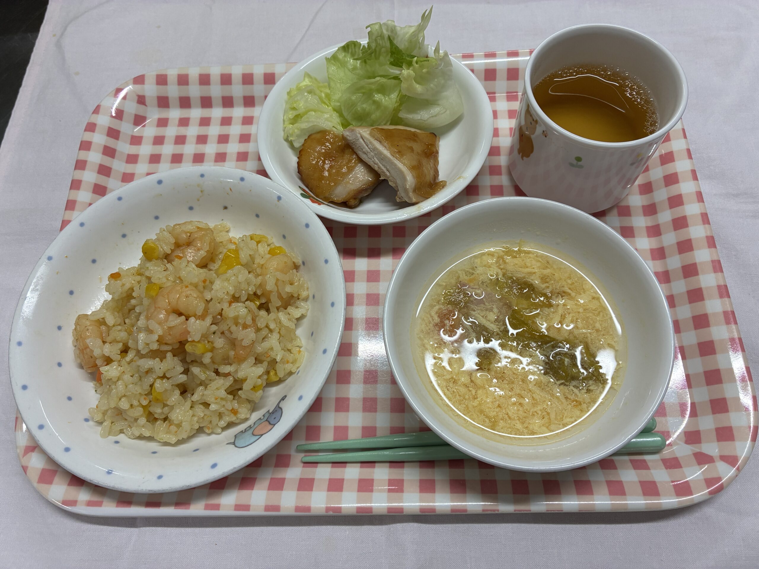 ・エビチキンピラフ ・鶏肉のマーマレード焼き ・トマトと卵のスープ