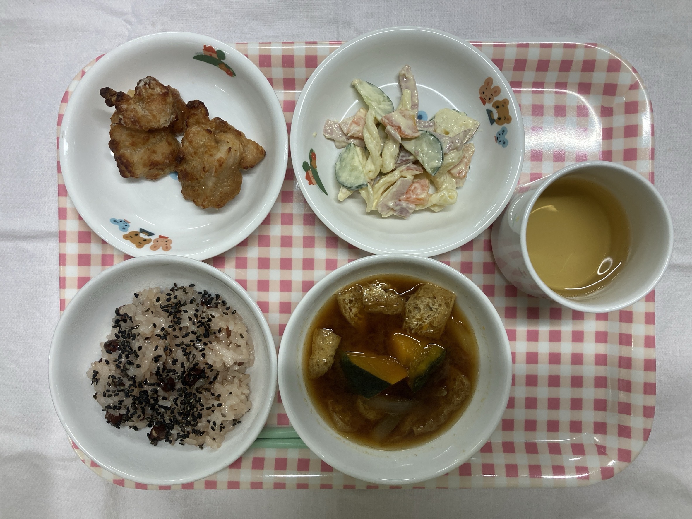・赤飯 ・鶏のから揚げ ・マカロニサラダ ・南瓜の味噌汁
