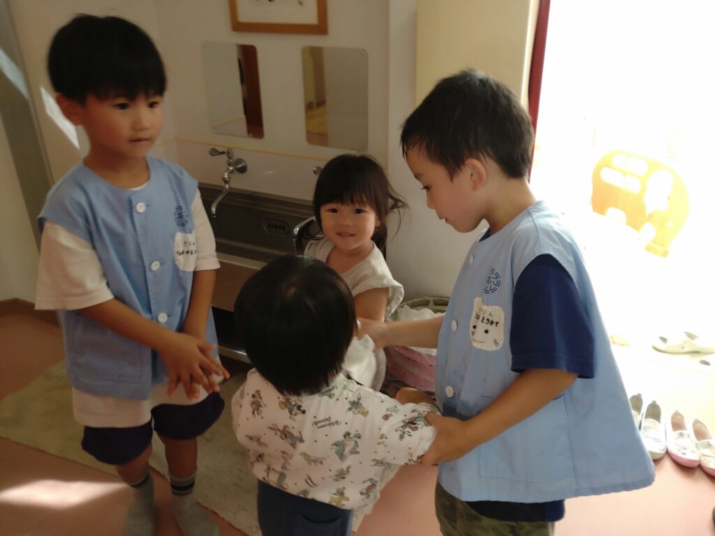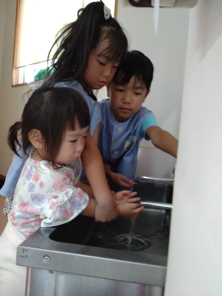 お昼寝後のおやつ。手洗いをお手伝いしてくれました。