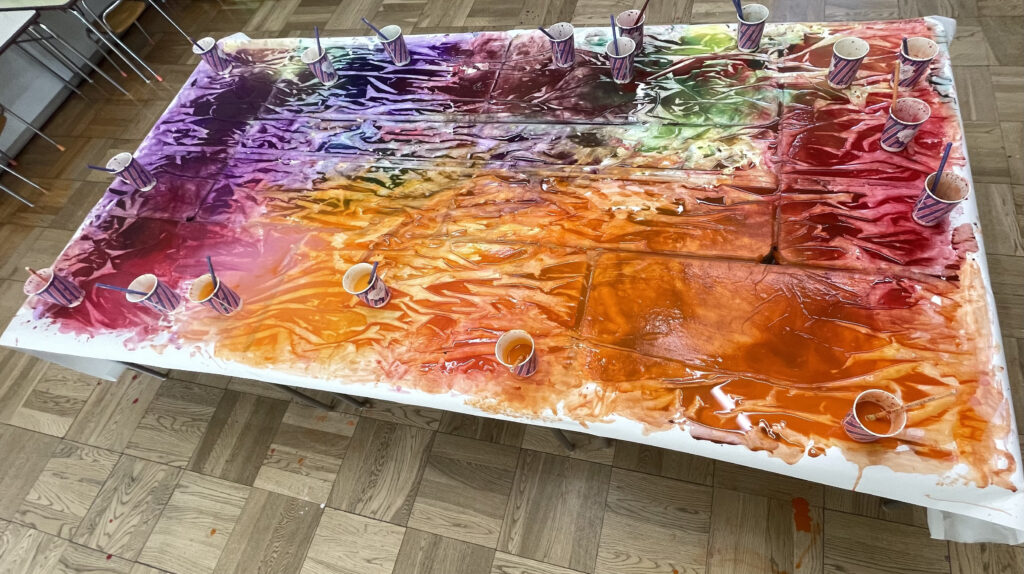 まずはお部屋で、いつもの紙とは比べられないほどの大きな紙に色をバシャーーーーン