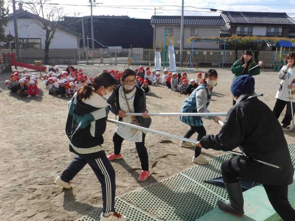 「さすまた」の練習もしました。 不審者を子どもたちに近づけないように 先生たちも必死です。