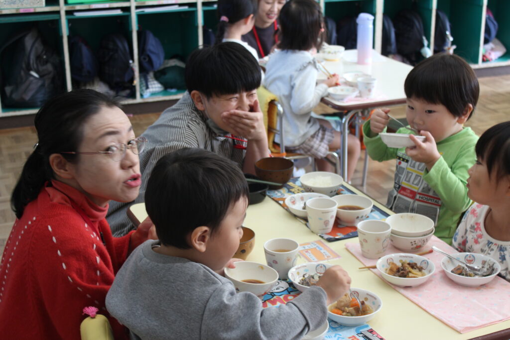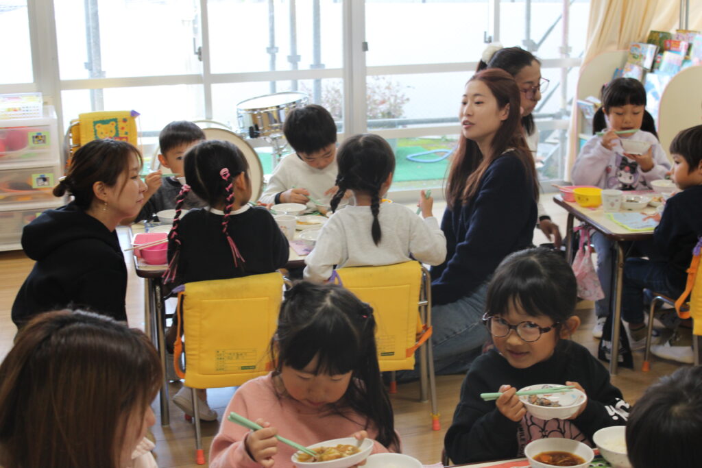 昨日は 以上児さんの給食参観日がありました。 クラスを半分にわけ 10日と17日に行います。保護者の方にはお家から空のお弁当箱を持ってきていただき 実際にお子さんの隣りで 味見程度ですが、給食を食べていただきます。