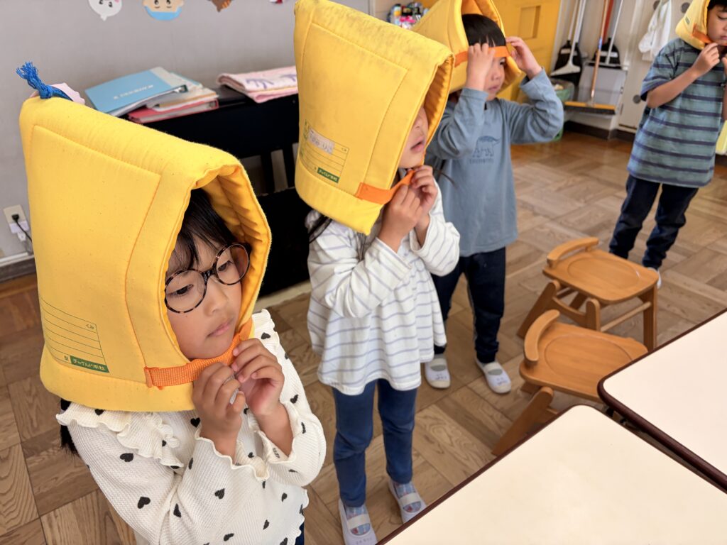 年長さんは 避難場所の確認をしたり、 防災クッションをかぶったりしていざという時に 備えます