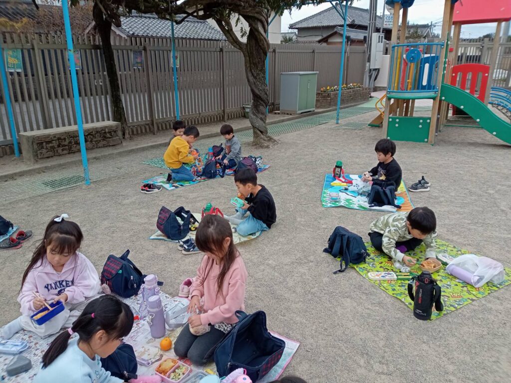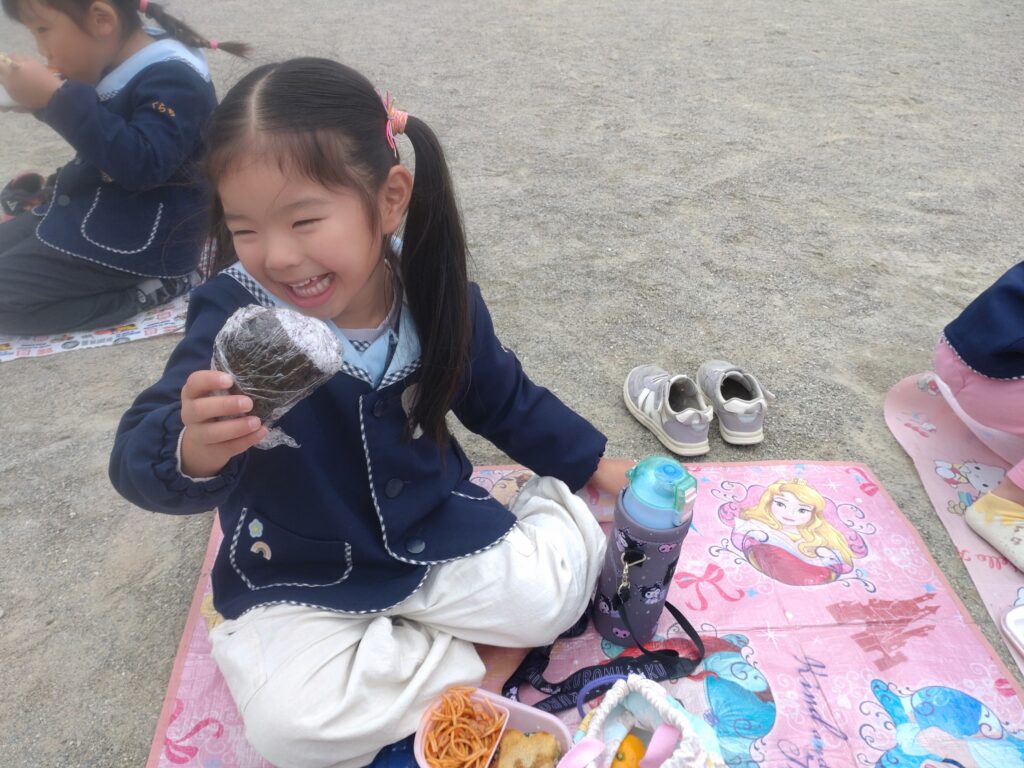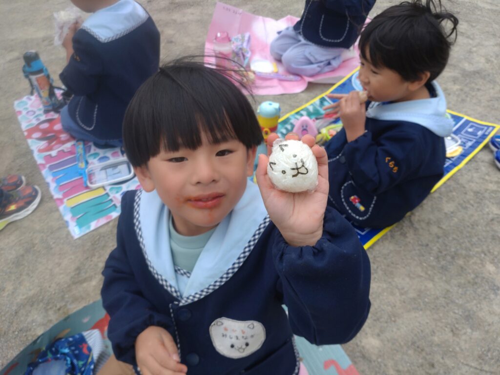 曇り空でちょっと寒かったですが、お家から持ってきたおにぎりと保育園の給食を詰めたお弁当を園庭で食べました。
