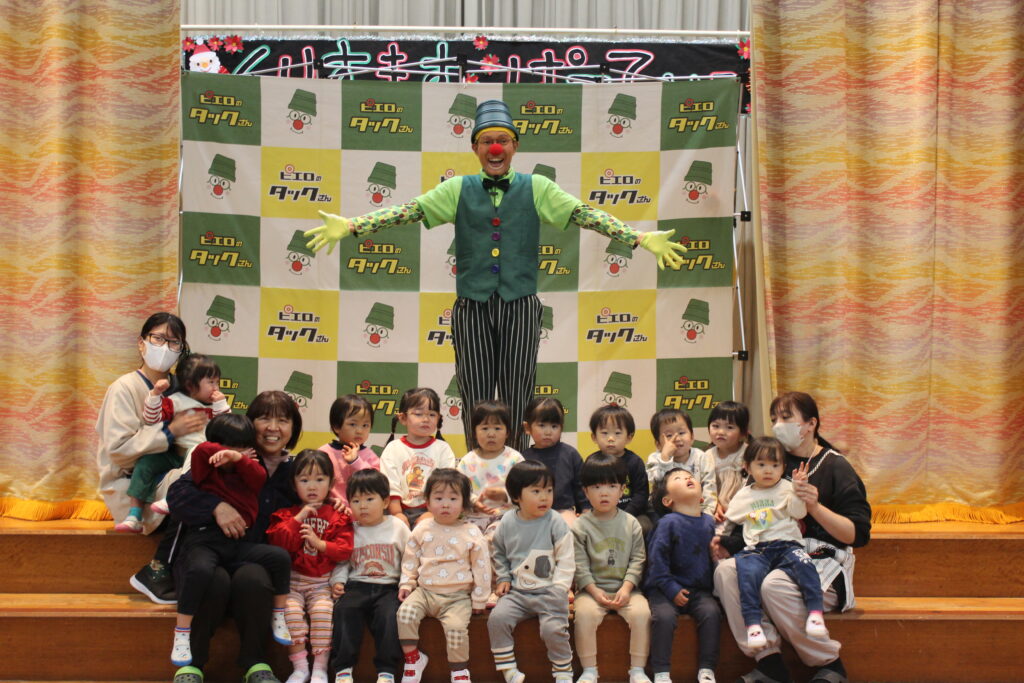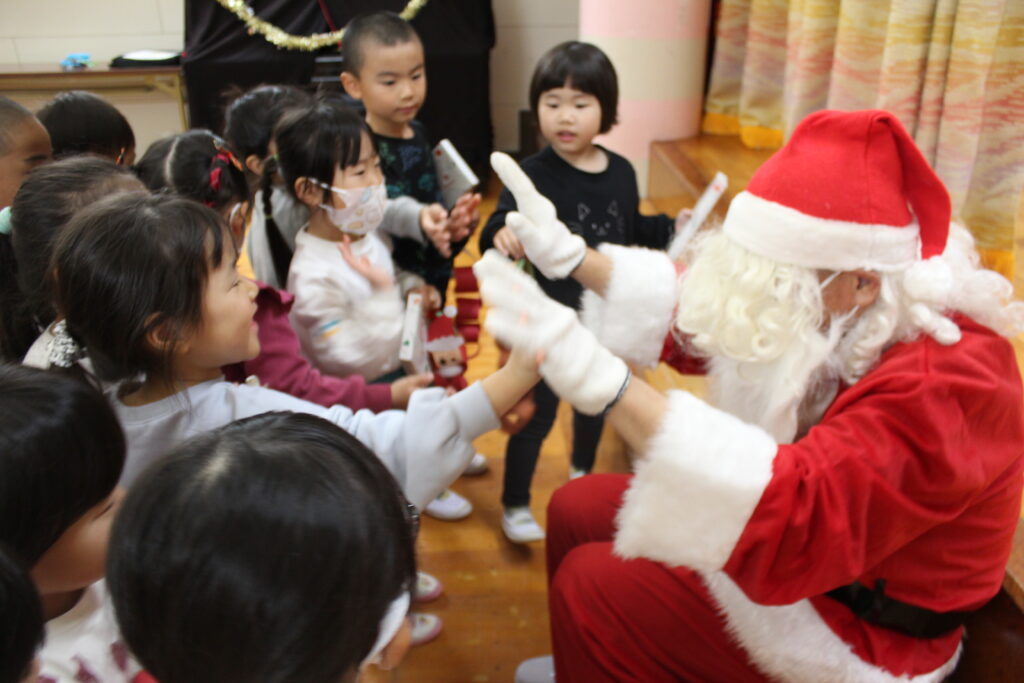 お昼からは なんと 保育園にサンタさんが 遊びにきてくれました。 鈴の音がすると みんな サンタさんがいるのかな?と探し始めましたよ。ホールのステージから サンタさんが登場すると 「ヤッター」 「サンタさんだぁ~」と とっても嬉しそう。 一人ひとり プレゼントをもらいました。