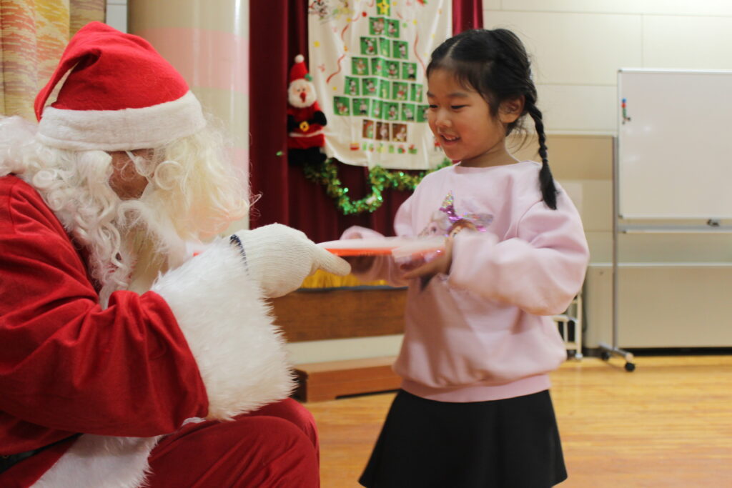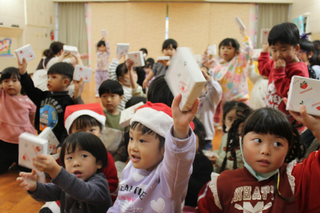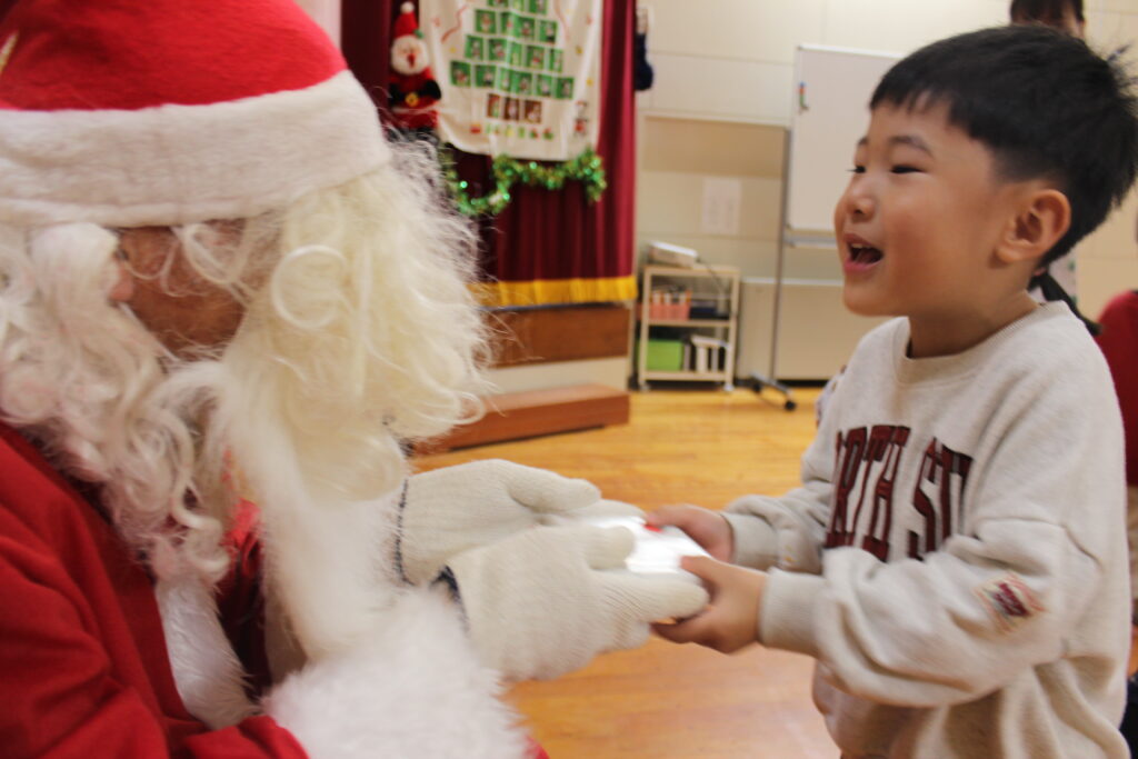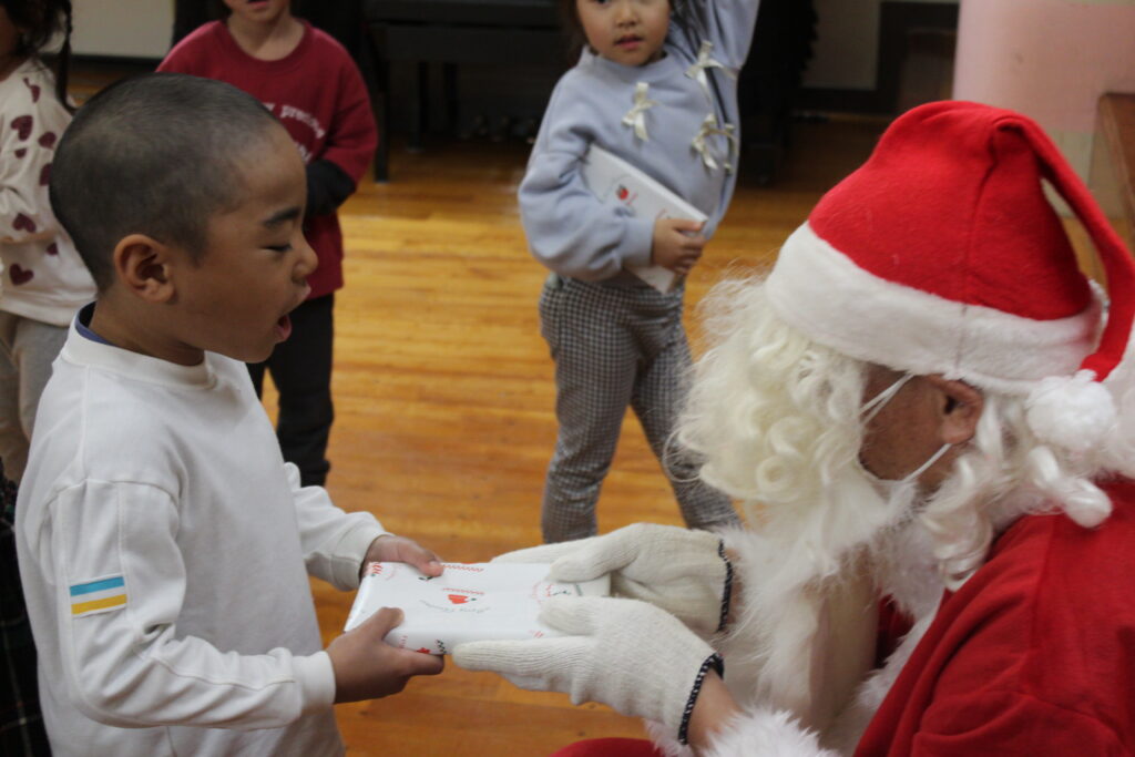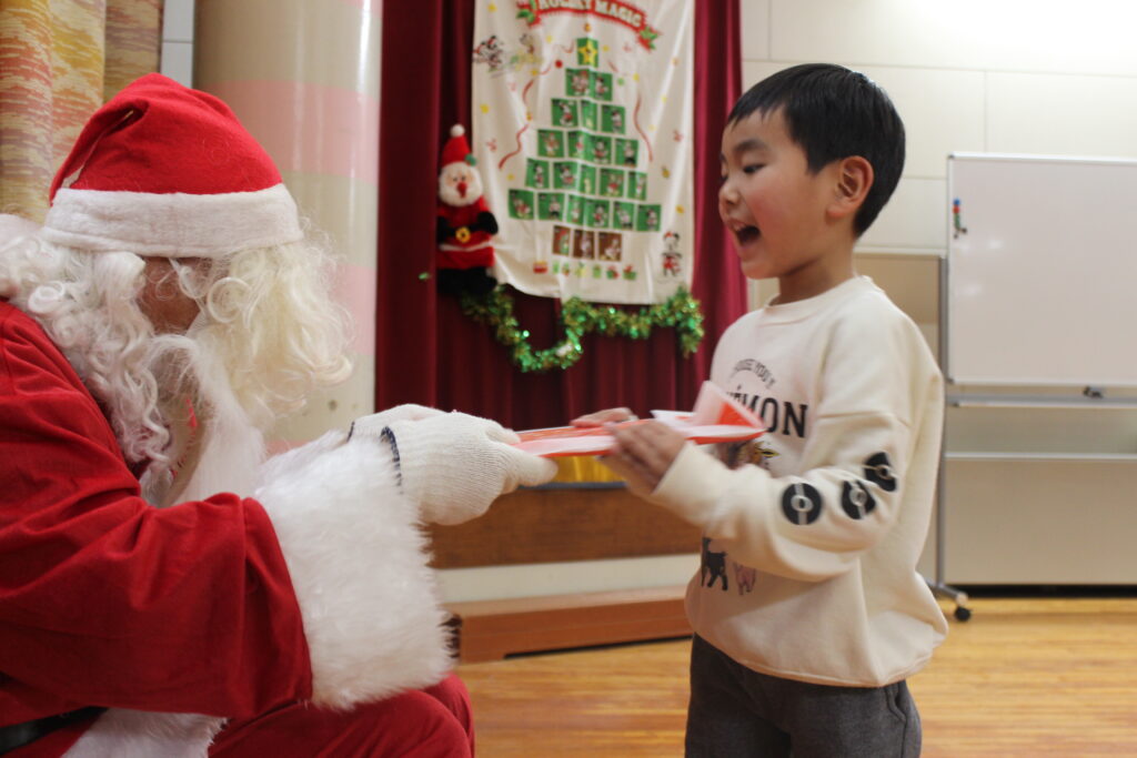 近くでみる サンタさんは 嬉しいような 少し怖いような…でも 「メリークリスマス!」と勇気を振り絞って声をかけると 優しくプレゼントをくれました。プレゼントをもらうと 表情は和らぎ みんなとっても嬉しそうでした。