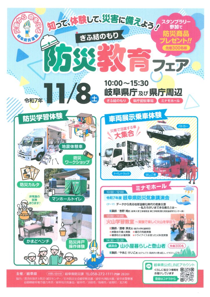 11月8日に 岐阜県庁及び 県庁周辺で「防災教育フェア」が行われます。是非ご参加くださいね。